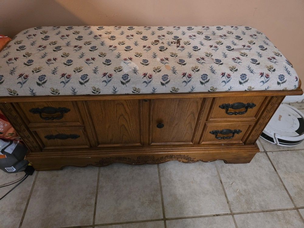 Used hope chest. Needs repairing. Paint on fabric and missing knob and missing key. Need gone.