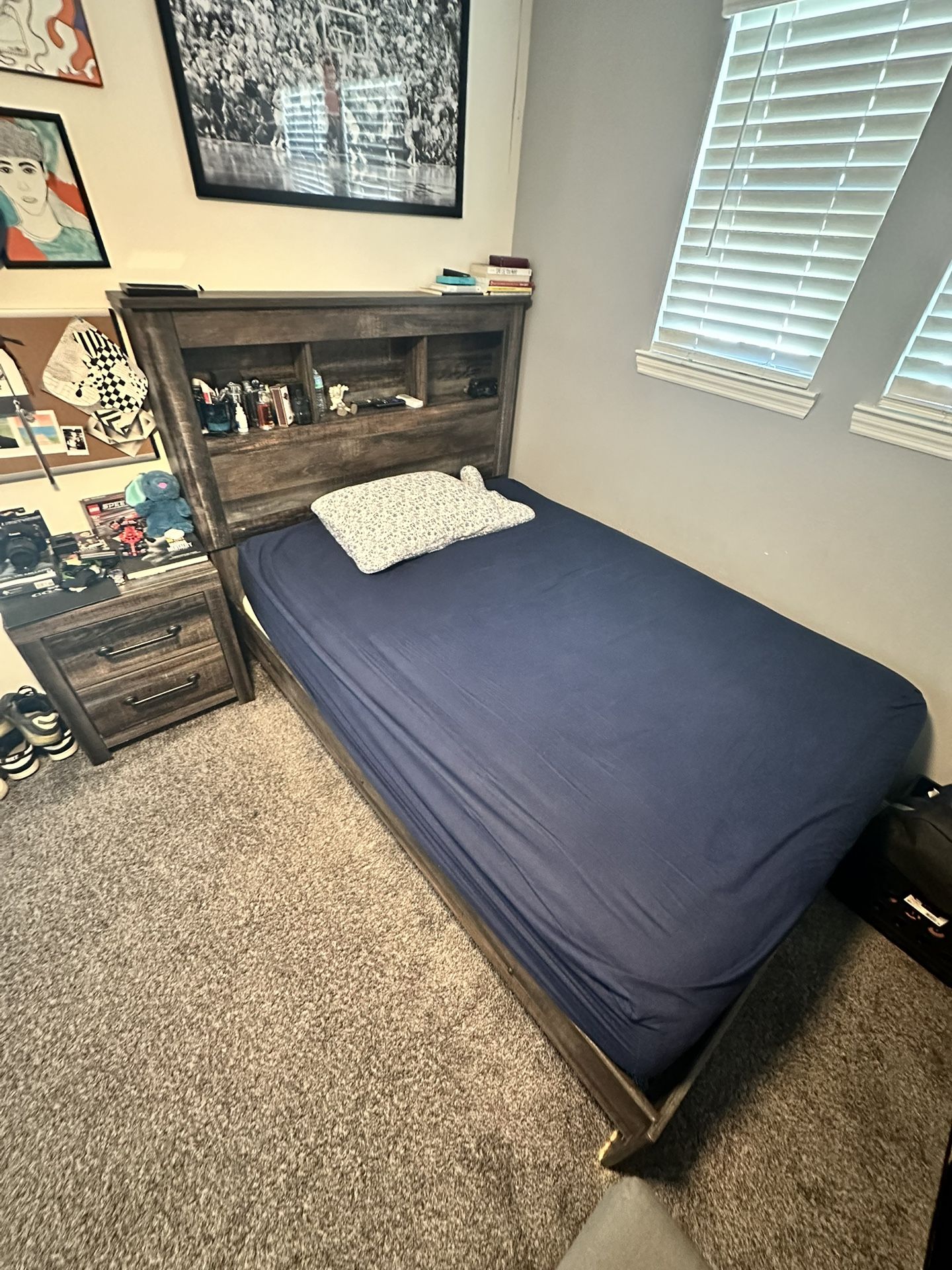 Cozy Bedroom Setup for Sale! Dark wood bed frame with built-in shelves, matching nightstand with two drawers, and a comfortable mattress. Perfect for a guest room or teenager's room. Used, but well-maintained and in good condition. Some minor scratches and wear on the wood. *Asking Price: $200 OBO MOVING OUT!!!