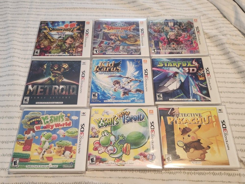 Prices below: Zelda Ocarina - SOLD Zelda between worlds - SOLD Zelda Majora's - SOLD Mario Party Star Rush $35 Mario Party Island Tour $35 Mario Party Top 100 - SOLD Mario & Luigi Superstar Saga $65 Sealed Mario Luigi Paper Jam $50 Sealed -SOLD Mario & Luigi Bowsers inside Story $120 Animal Crossing New Leaf $25 - SOLD Animal Crossing Home $25 - SOLD Mario & Luigi Dream Team $30 Mario 3D maker - SOLD Mario kart 7 $25 Super Mario Bros 2 - SOLD Mario 3D Land $30 Super smash bros - SOLD Super Mario Bros - SOLD NES remix $40 - SOLD Paper Mario $45 Luigi's mansion $30 Kirby Robobot $65 Kirby Triple Delux - SOLD Kirby Extra epic yarn $120 Yoshi's island $30 Yoshi's Poochy woolly world - SOLD Star fox 64 3DS - SOLD Mega Man legacy $ 40 Donkey Kong Country 3D - SOLD Super Street fighter $25 Kid Icarus 3DS $80 Detective Pikachu $50 Metroid Samus Returns - Sealed $60 Dragon Quest VII $ 100 Sealed Dragon Quest VIII $130 Radiant Historia 3DS $120 - Sealed All games are 1st edition first print games. None of that AUE/Saudi Arabia/Malaysia/Singapore foreign copies which are worthless for collections. Everything is like new, complete and in amazing quality. If you want to bundle let me know which games. If you want more pictures let me know.