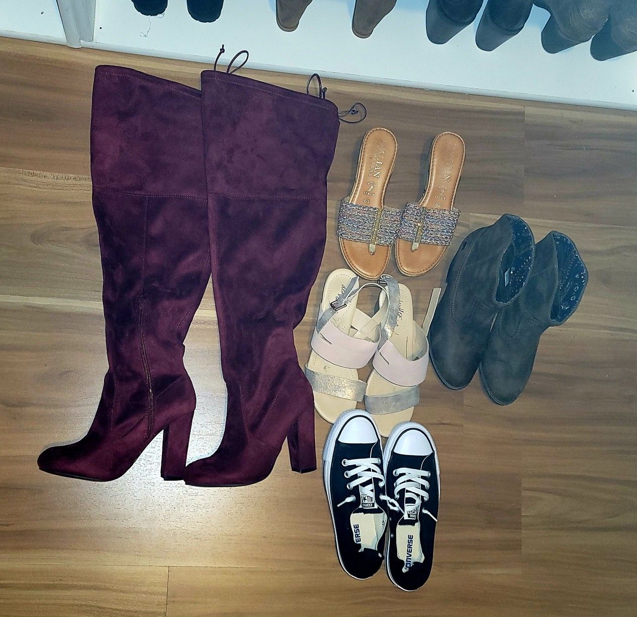 Maybe worn twice, still in great condition Thigh Boot sz 7 $15 Ankle boot sz 7.5 $15 Chucks sz 6.5 $20 Sandals 6.5 - 7 $ 10