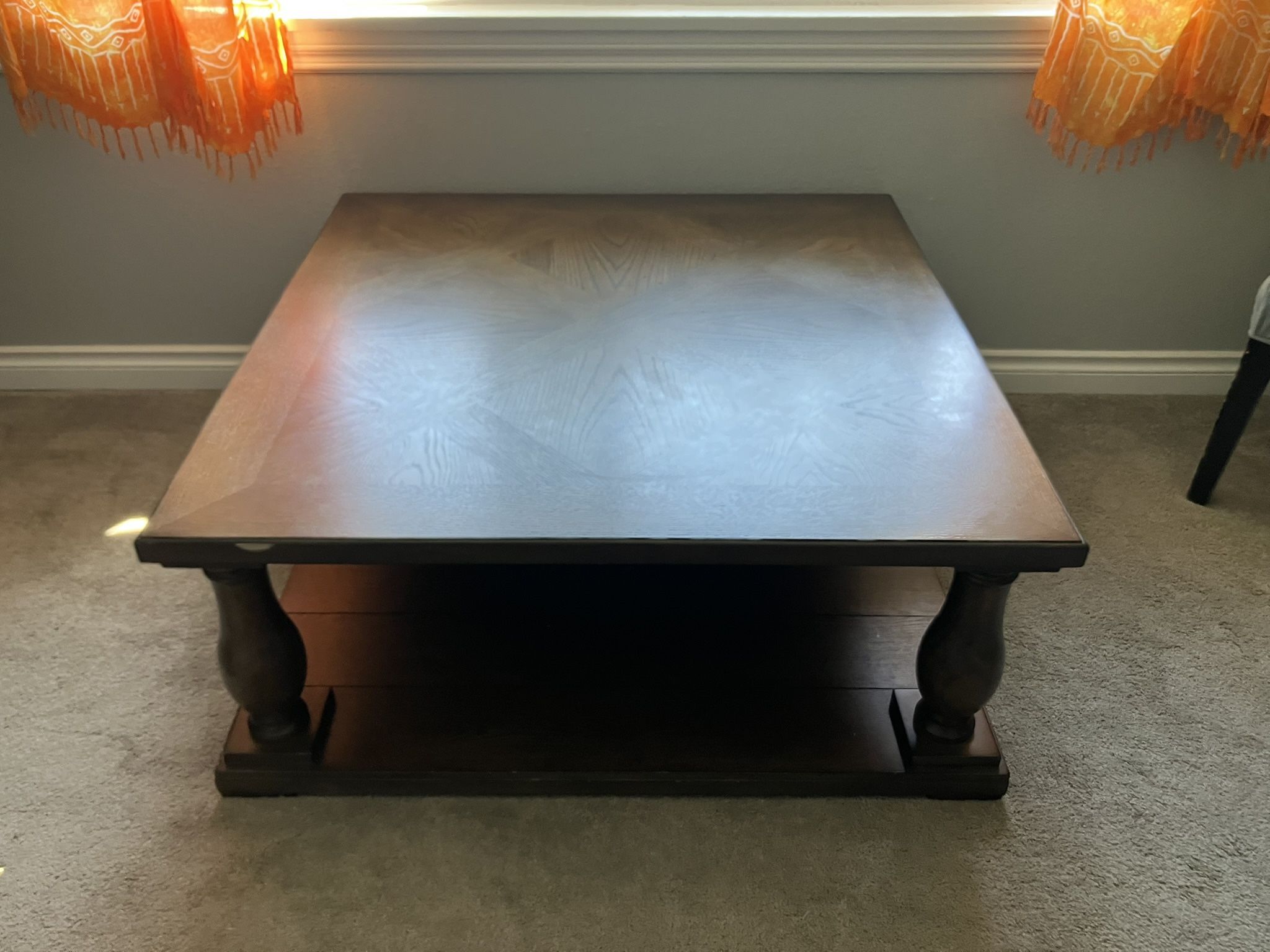 42”x42”x16” Scuffs on one side. Heavy duty table. Great for sitting with a floor cushion
