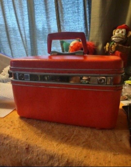 this is a true collectible 1962 Samsonite carrying case makeup case travel case hard strawberry case great for any project or a true collector think of all the ideas you could do turn this into a traveling video game case or carry your makeup online airplane travel bag or for your collection display the ideas are endless this is a must have it's in pretty decent shape for a 64 year old piece of luggage