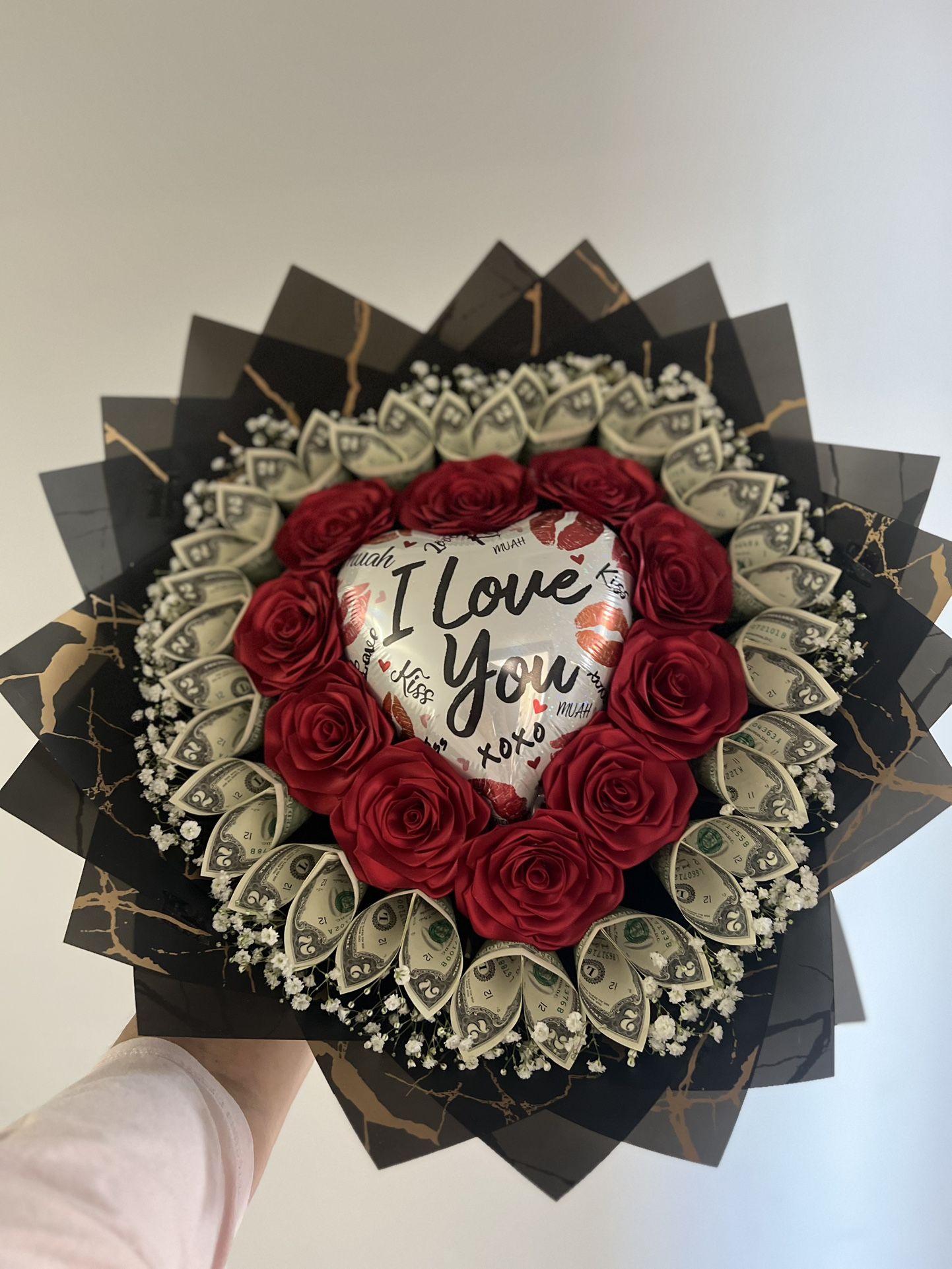 Bouquet has $36 dollars on bouquet with 10 roses , balloon , and baby breaths