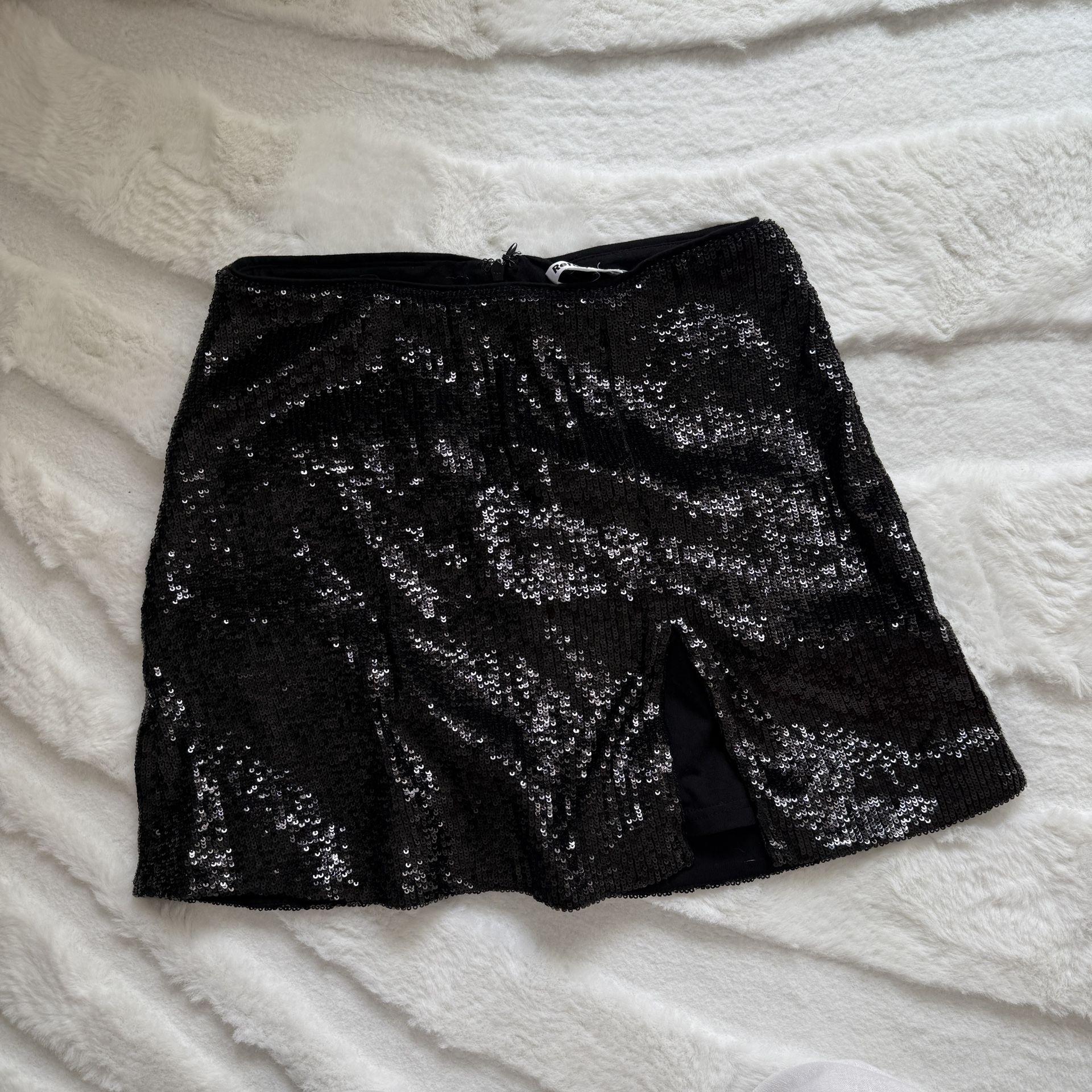 Black reformation sequin mini skirt with slit, size 2. Runs slightly large. Gently worn once. No rips, tears, or stains. Unfortunately no longer fits me since I gave birth. Local pickup in Bridgeport, Chicago, IL. Comes from a smoke-free home. All sales final; no returns.
