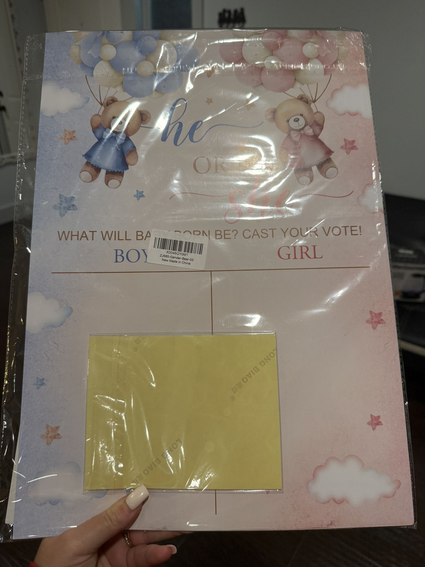 Beautiful gender reveal voting poster for your special celebration 🎈 Guests can cast their vote — Boy or Girl — using stickers. Adorable teddy bear design with balloons in soft blue and pink colors 💙💗 Perfect for: • Gender Reveal Party • Baby Shower • Photo backdrop • Family celebration Includes: ✔️ “He or She” poster ✔️ Voting stickers ✔️ Brand new, sealed Creates a fun and memorable moment and looks amazing in photos 📸 A lovely way to announce your baby’s gender
