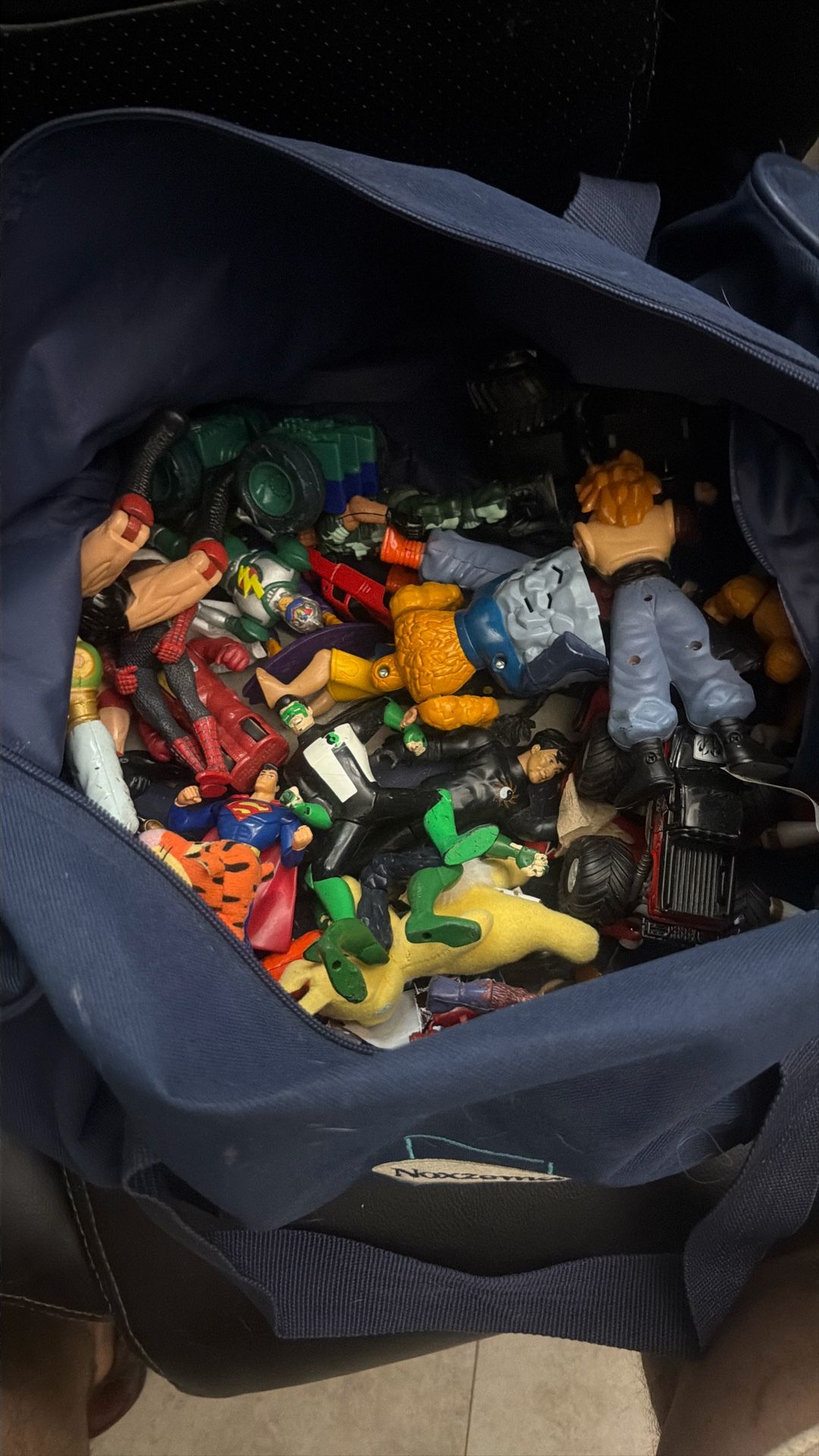 Large bag of mixed toys and action figures. Includes a variety of characters and styles such as superheroes, wrestling/action figures, vehicles, and random figures. Some recognizable brands mixed in (Marvel/DC/WWE-style figures), plus others.