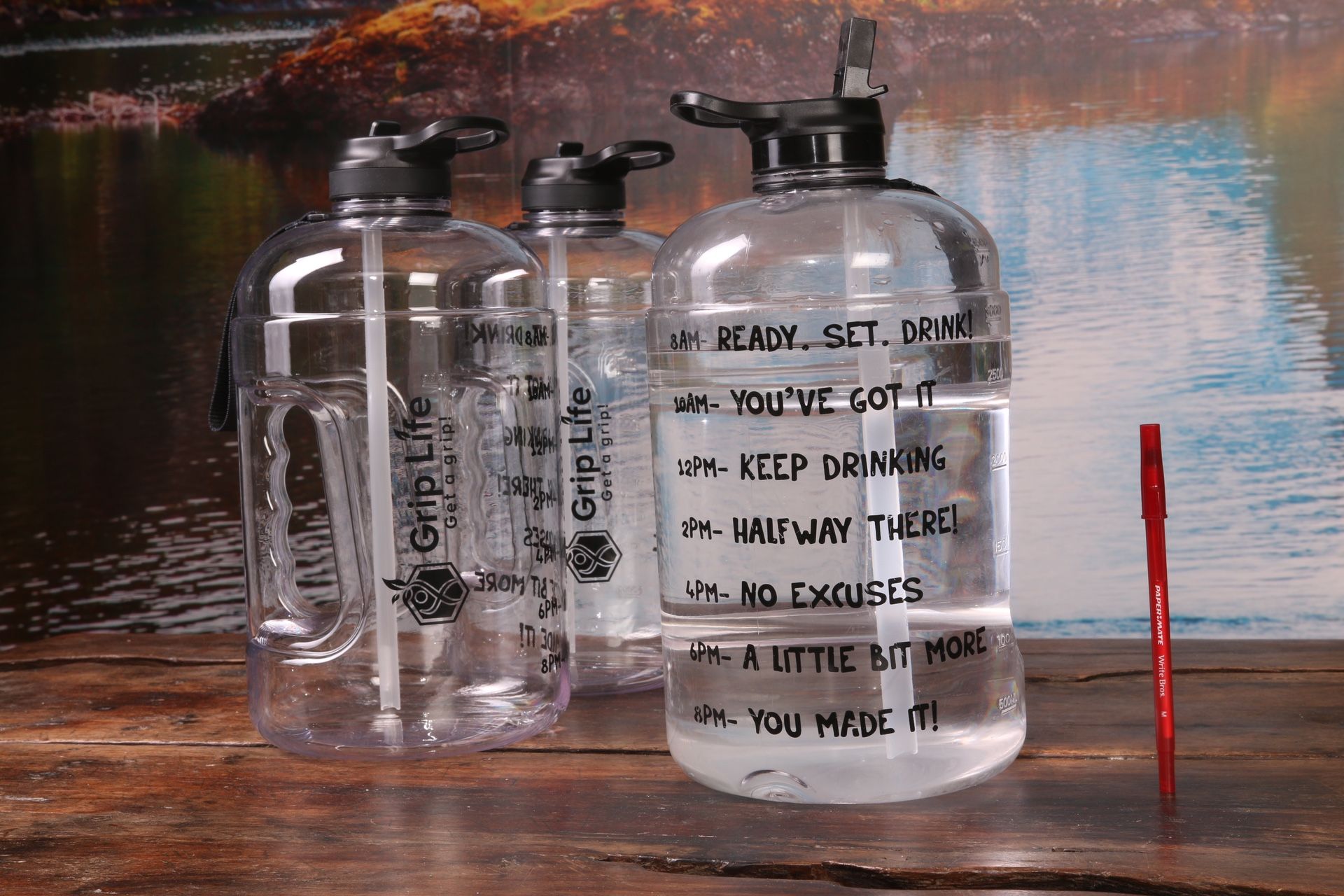 Brand New Multiple Available Doctors and nutritionists agree that the average female needs around 92 ounces of water a day, and the average male needs 128 ounces. You can get a GRIP on your hydration with this 128 ounce Motivational Water Bottle. Starting at 8am, your daily water goals are mapped out in 2 hour increments with great motivational sayings. * Nozzle with straw for easy driking * Molded easy lift handle * BPA-free * 128oz (1 Gallon) capacity * Durable nylon strap * Hand Wash Only