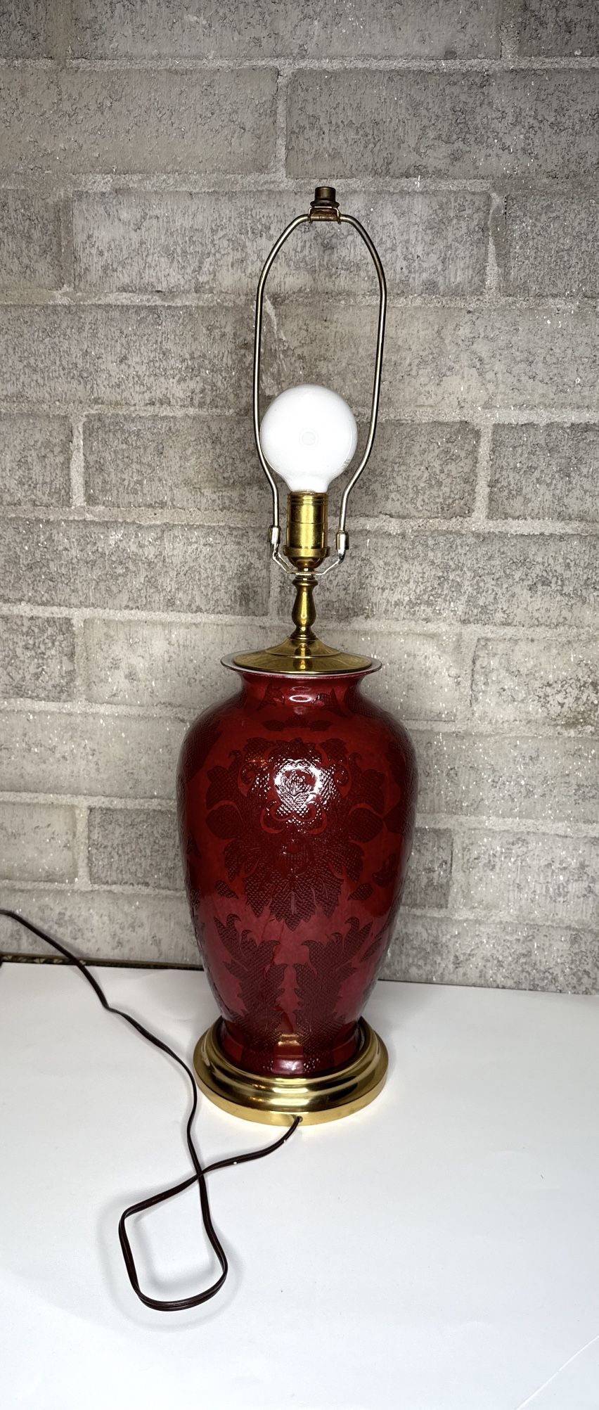 35th Ave and Northern Beautiful vintage red/burgundy ceramic table lamp with an elegant ginger jar/vase shape, subtle floral/scroll pattern, and brass-tone base + hardware. Marked Made in China. Stands approx. 31” tall (to top of harp). Great statement piece for traditional, Hollywood Regency, or eclectic décor. Shade not included. Some light surface wear to brass from normal use—see photos.