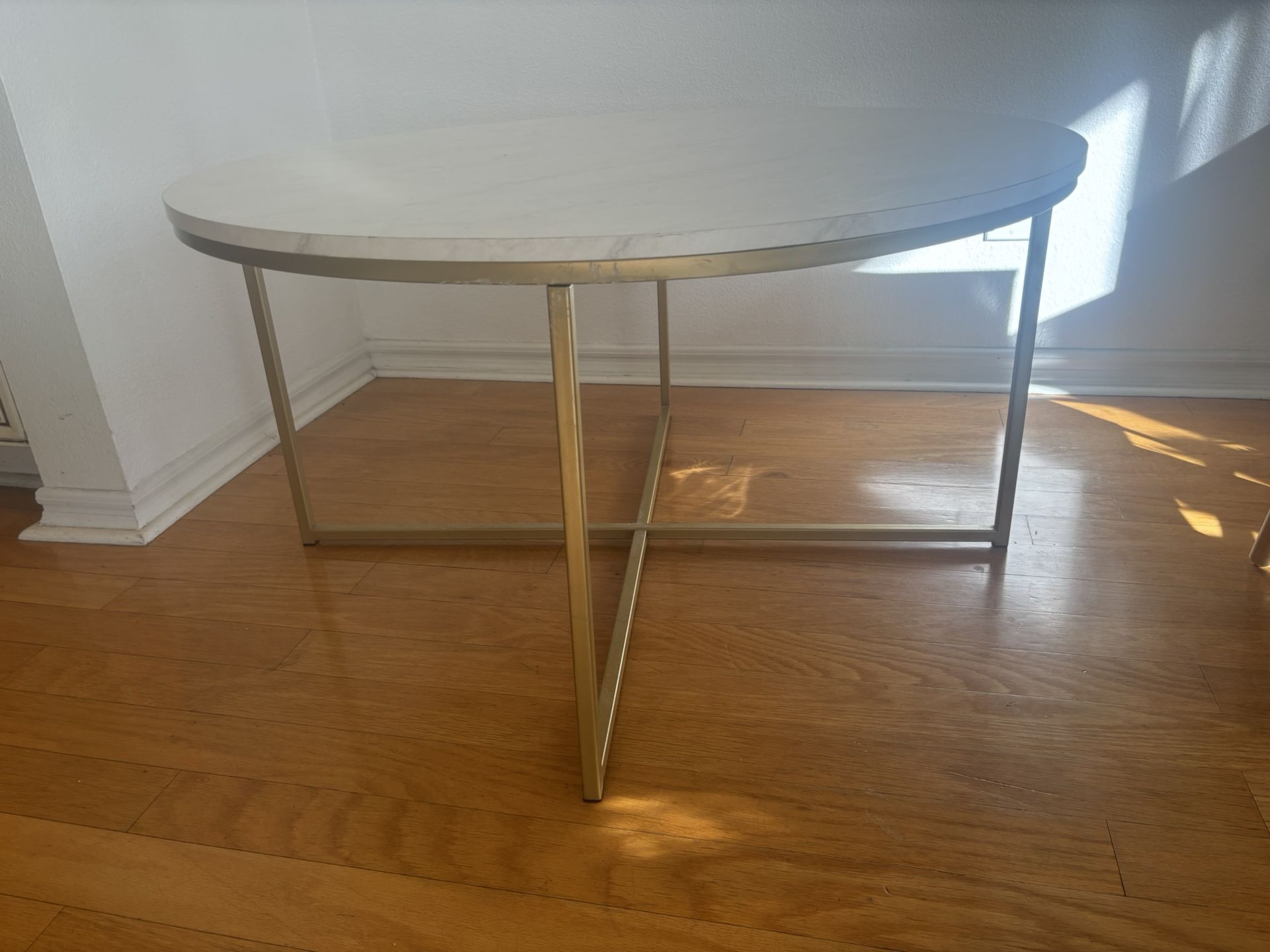 White / gold / brass lightweight coffee table. 3ft in diameter 19in high Perfect for playing games, putting your feet up to watch TV, and holding drinks. Cleans easily. Pickup in 90035