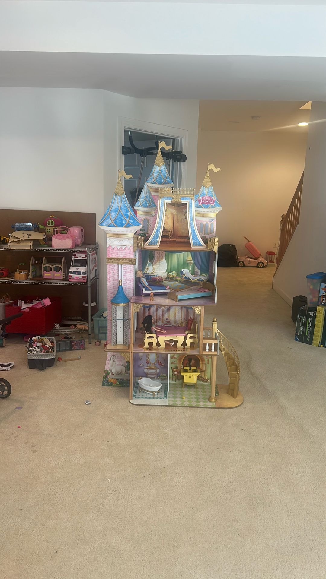 Disney castle stands a little over 5 feet, good condition, comes with 2 dolls, a lounge chair, bed. Table with chairs, a tub, and stove.