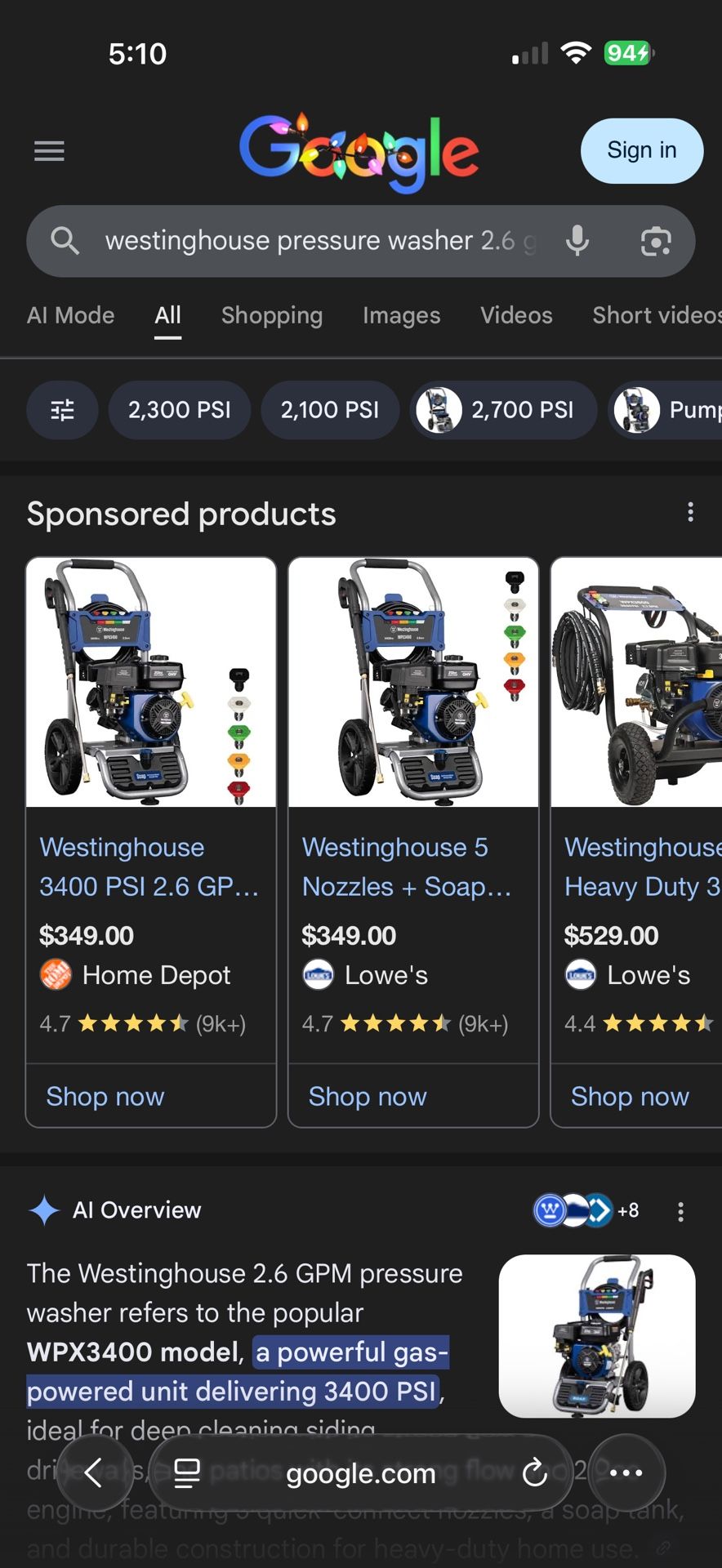 Selling my Westinghouse pressure washer in new condition 3400 PSI 2.6 GP basically new condition asking $250 firm price !