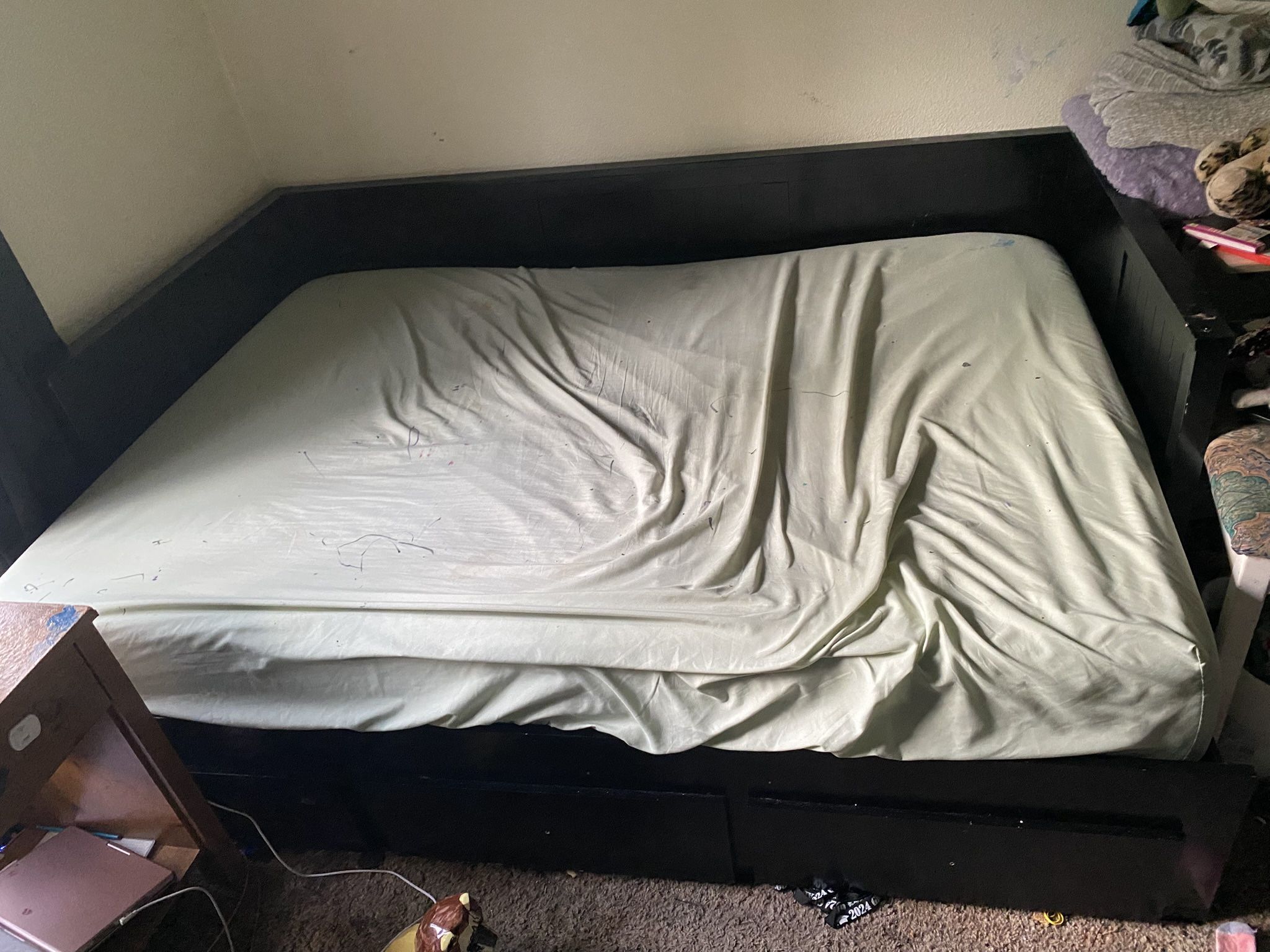 A full bed, also known as a double bed, is a great size for a bedroom. It provides ample space for one or two people to sleep in. It has three drawers, but the handles are stripped but can be fixed by some nuts and bolts. It does come with a full mattress. Two sheet sets and two mattress protectors.