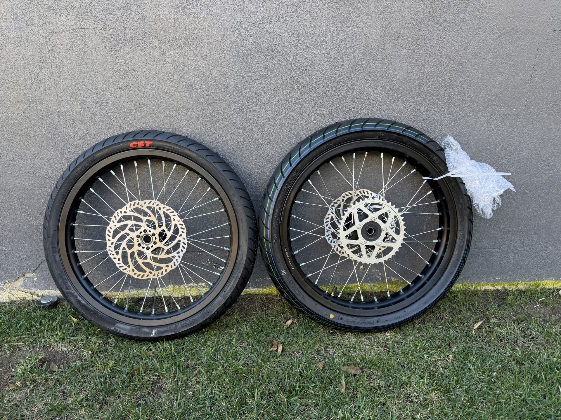 Brand New pair of factory OEM Supermotos Specifications: Front tire: 70/90-17, rim: 1.60 Rear tire 90/80-17, rim: 2.15 -203mn brake rotor front -203mm brake rotor rear -42 tooth sprocket -102 link chain Pick up in Eastlake Chula Vista NO TRADES!