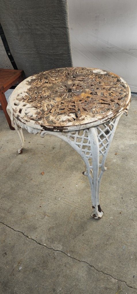 Antique Beautiful Cast Iron Round Table. I started refurbishing but not complete. Can continue removing paint or just put a rust sealer and paint. Unique rare to find.