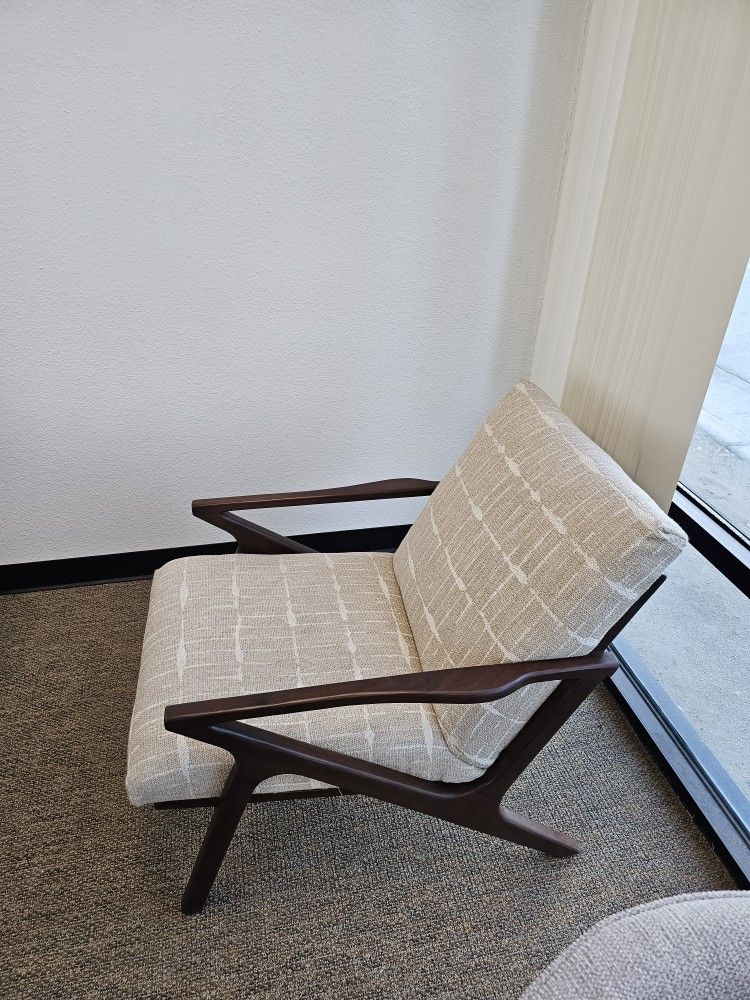 Price: $549 Modern style with a unique classic Danish design Approx dimensions: 28" W x 37" D x 28" H Fabric cushions Walnut-finish wooden frame. Open items/store display. Furniture store address: 68945 Perez Rd Suite 1 Cathedral City, CA 92234 Store Hours: 11:00am to 5;00pm Open Wednesday through Saturday Closed Sunday through Tuesday Delivery available Financing available Same day delivery available