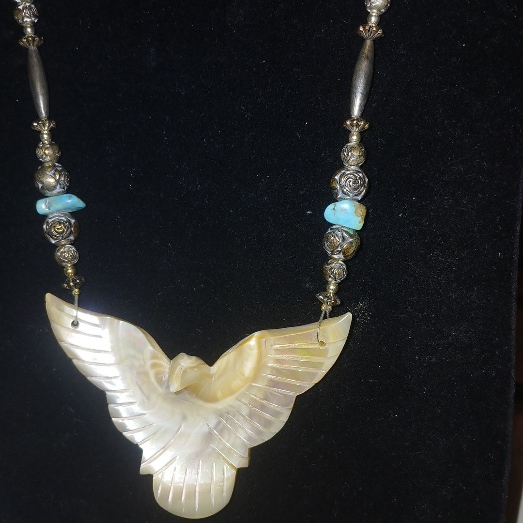 This necklace is very unique and one of a kind the eagle is made out of Mother of pearl and the necklace has turquoise beads and silver very nice and the L of necklace is 24 inches L