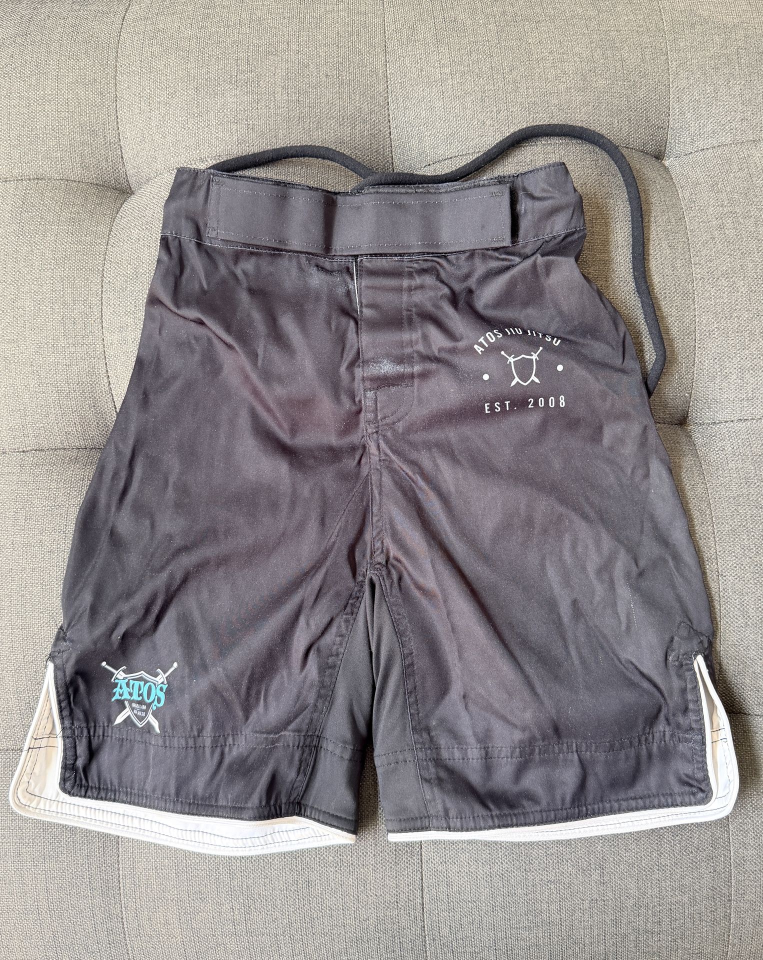 Atos grappling shorts for great performance. Good quality lightweight material, some wear. Elastic gripping waistband with drawstring, above the knee fit, hidden pocket. Size 6. Room for your kid to grow in them.