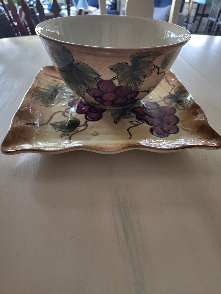 Beautiful serving plate and bowl by Chardonnay with grapevines. Perfect for cheese plates, appetizers and so much more.