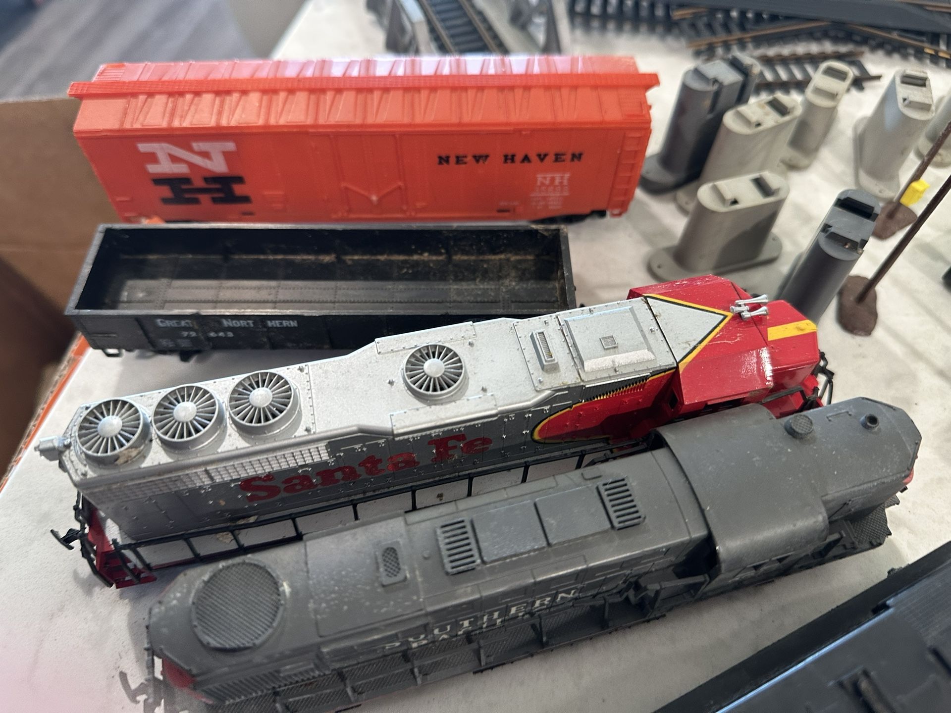Model Train set with tracks bridges houses. Tyco, Bachmann, Yarney. Engines, Cars, Tracks and Controllers. Bridges, track risers electrical poles, 5 different engines with several train cars. It was given to me. Never set it up. Have no idea on what they are worth. Pricing to sell.