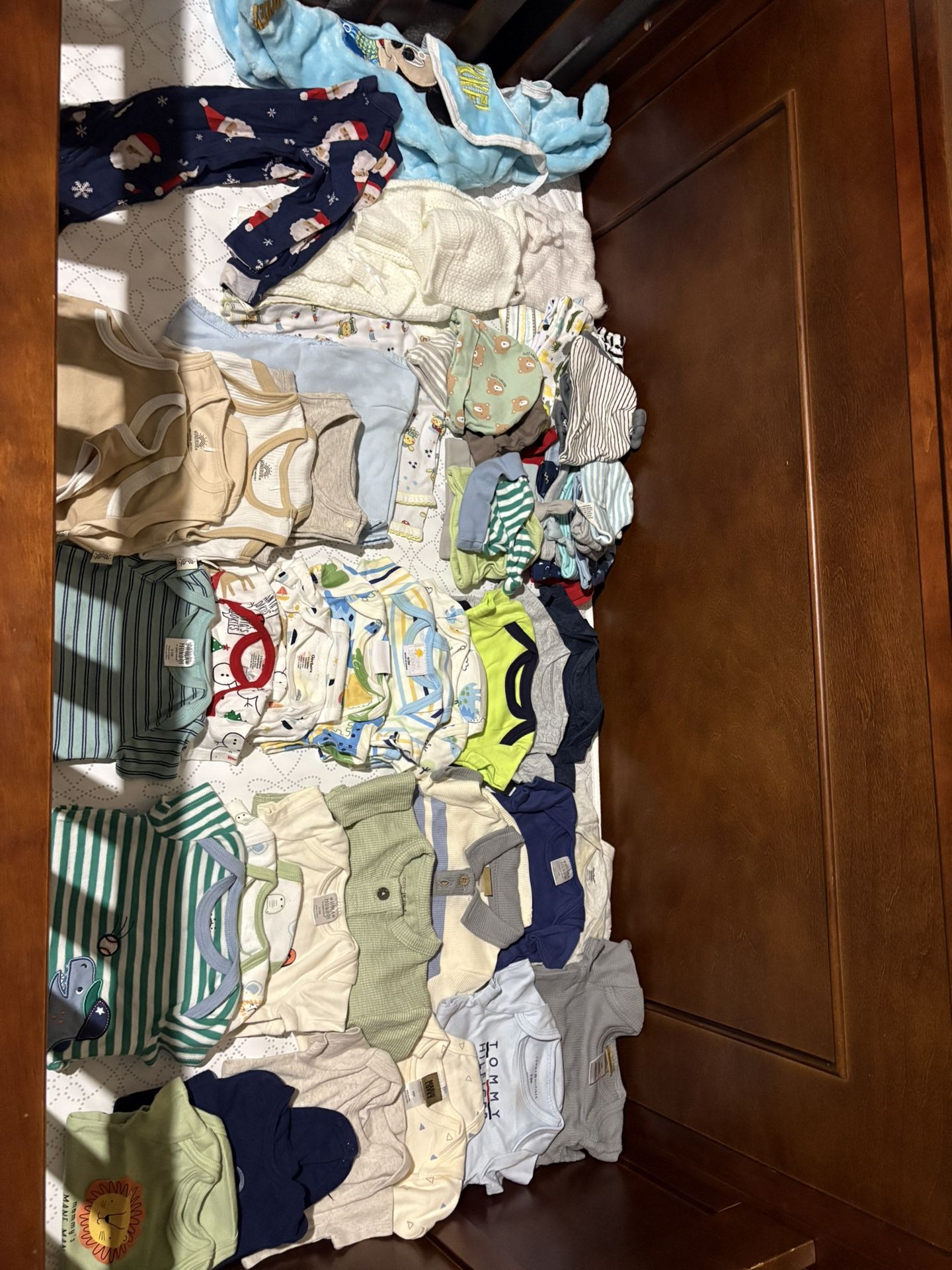 A little more than 250 pieces of clothes including baby socks, baby hats, gloves, bottles and bottle nipples, breast pump, baby bibs and baby bath support