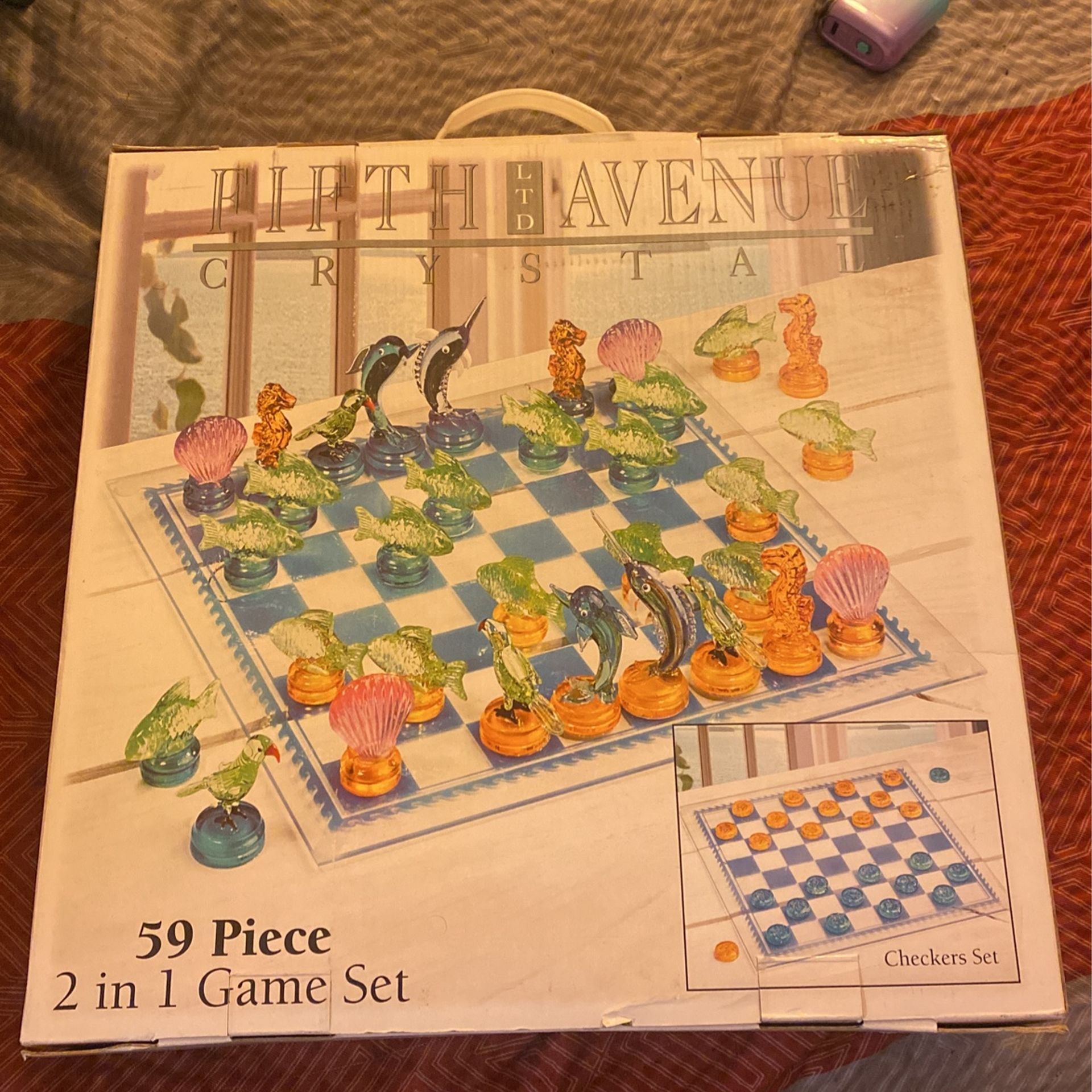 Contains 59 pieces of crystal chess and checker pieces and board. All intact none missing