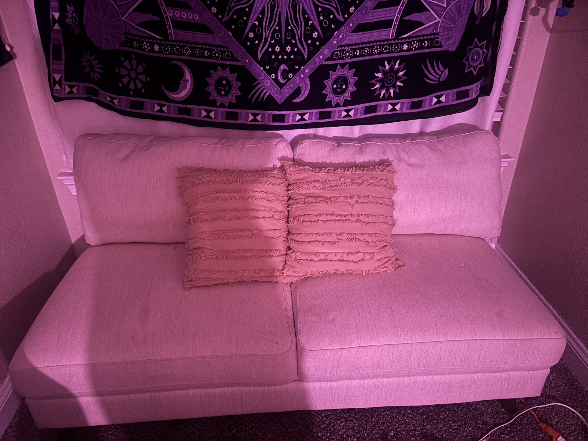 Has some wear and tear but originally $360. I have had it for a few years in my room. Lower to the ground and no arm rests.