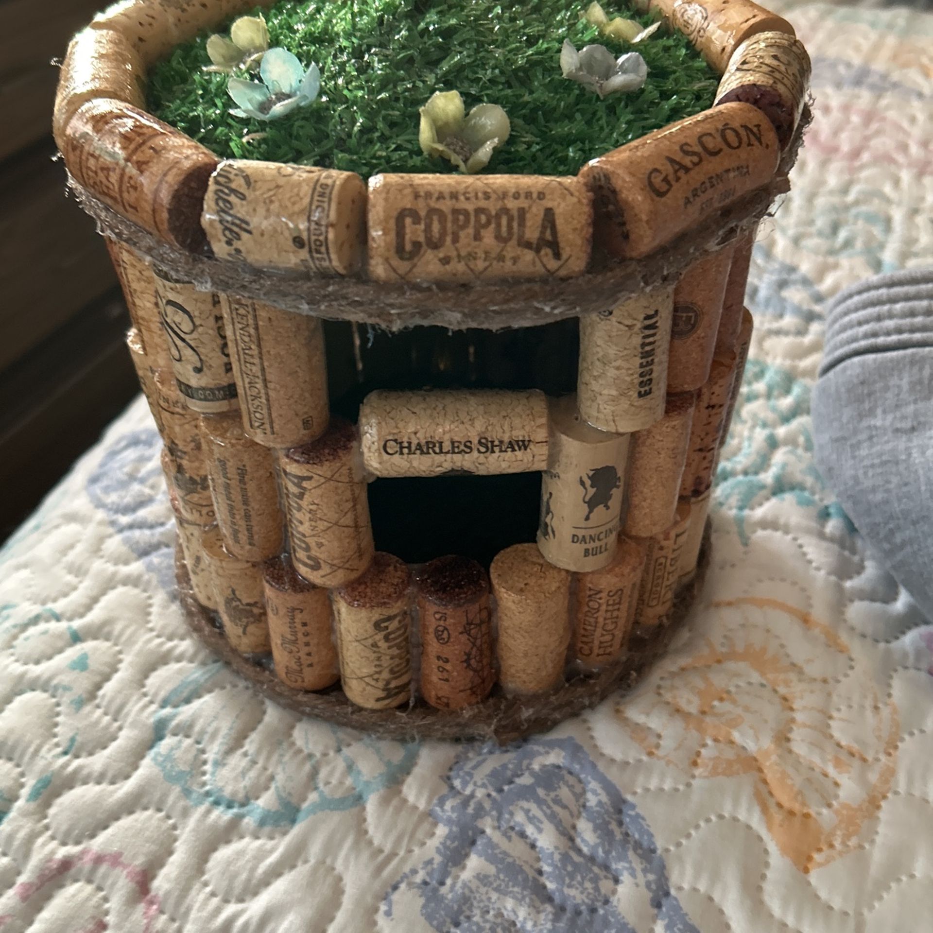 Hand made wine cork bird house corks came from all over the world. 25.00 weather protected.