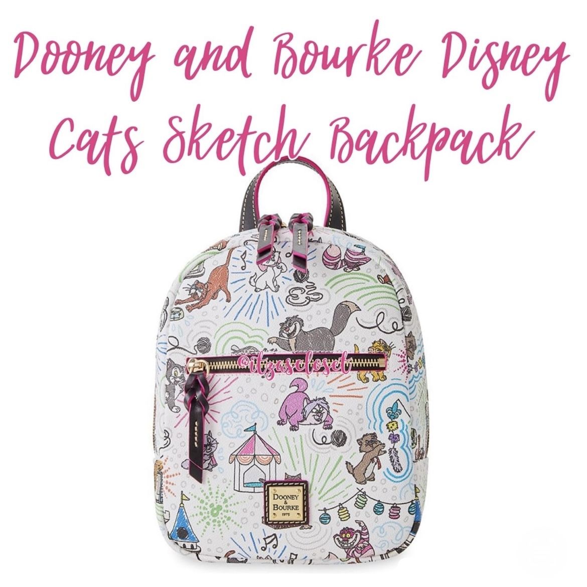 Disney Dooney & Bourke Bag - Disney Cats Sketch - Backpack NWT Brand new with tags still attached. Pictures are exact item you will receive. Meow! You'll love traveling around in the company of your favorite Disney felines. This compact backpack by Dooney & Bourke is simply purrfect for cat-loving Disney fans everywhere. The allover sketch pattern print features a clowder of familiar fluffy film felines. Characters include Duchess, Berlioz, Toulouse -The Aristocats Lucifer -Cinderella Dinah -Alice in Wonderland Oliver -Oliver & Co. Yzma as Cat -The Emperor's New Groove Figaro -Pinocchio Cheshire Cat -Alice in Wonderland Madam Min -Sword in the Stone Rufus -The Rescuers Binx -Hocus Pocus Stitched leather trim with pink edging Structured case styling Double zip main compartment Braided leather pulls Exterior front zip pocket Exterior back zip pocket 11” H x 9” W x 5 1/4” D
