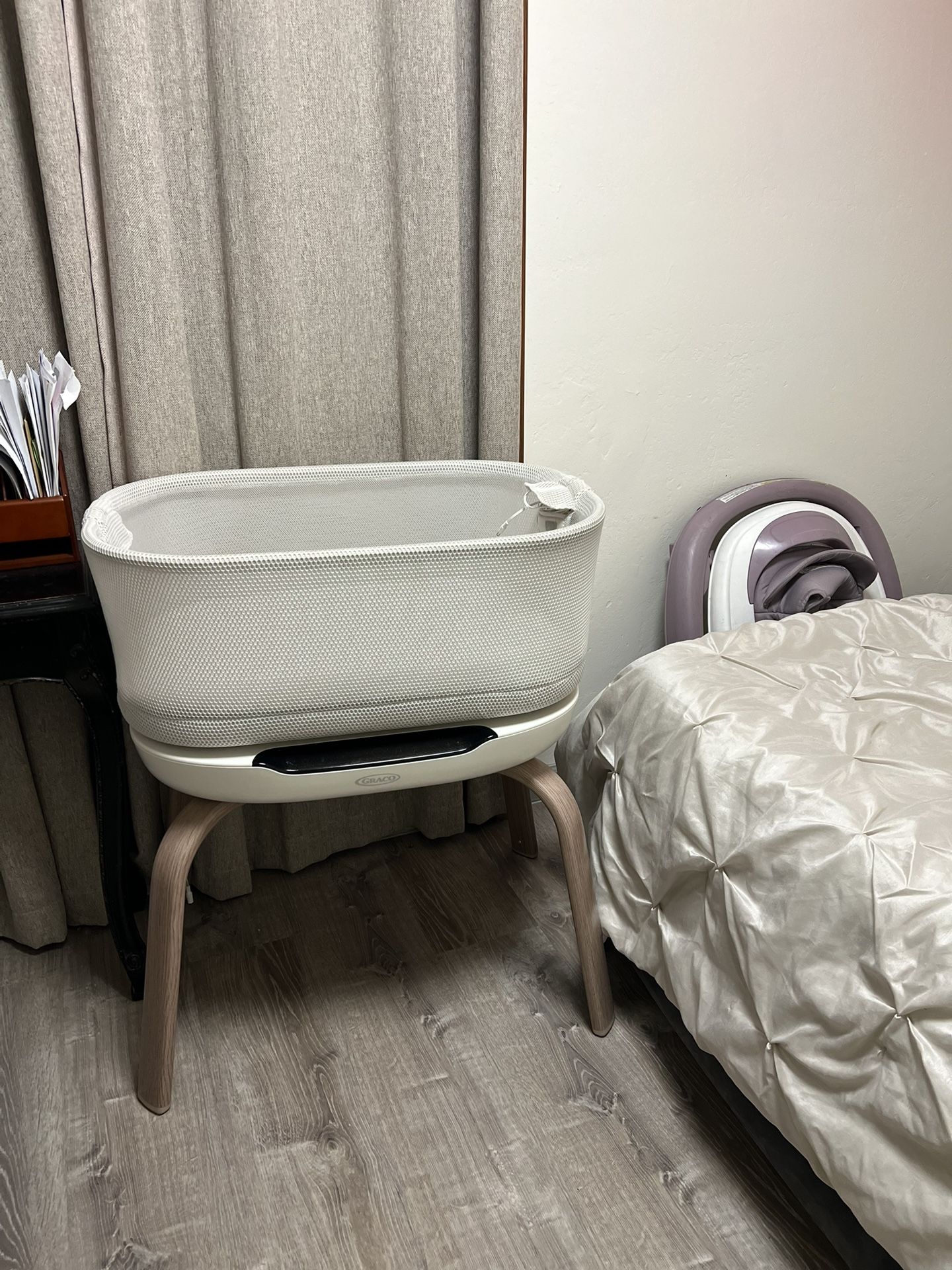 This moving Graco SmartSoothe Luna Bassinet will have your little one drifting off comfortably FEATURES Moving sleeper bassinet soothes babies with syced sound and gentle rocking motion Cry Detection Technology detects fussing and the self-rocking bassinet responds with gradually stronger white noise + motion to calm crying Breathable mesh walls for air flow Advanced Cry Detection™ technology can tell baby cries from room noise Woodgrain finish to seamlessly fit with home Variety for soothing - multiple speeds motion, vibration, white noise options, and soothing sounds Bluetooth connectivity Easy to clean mattress