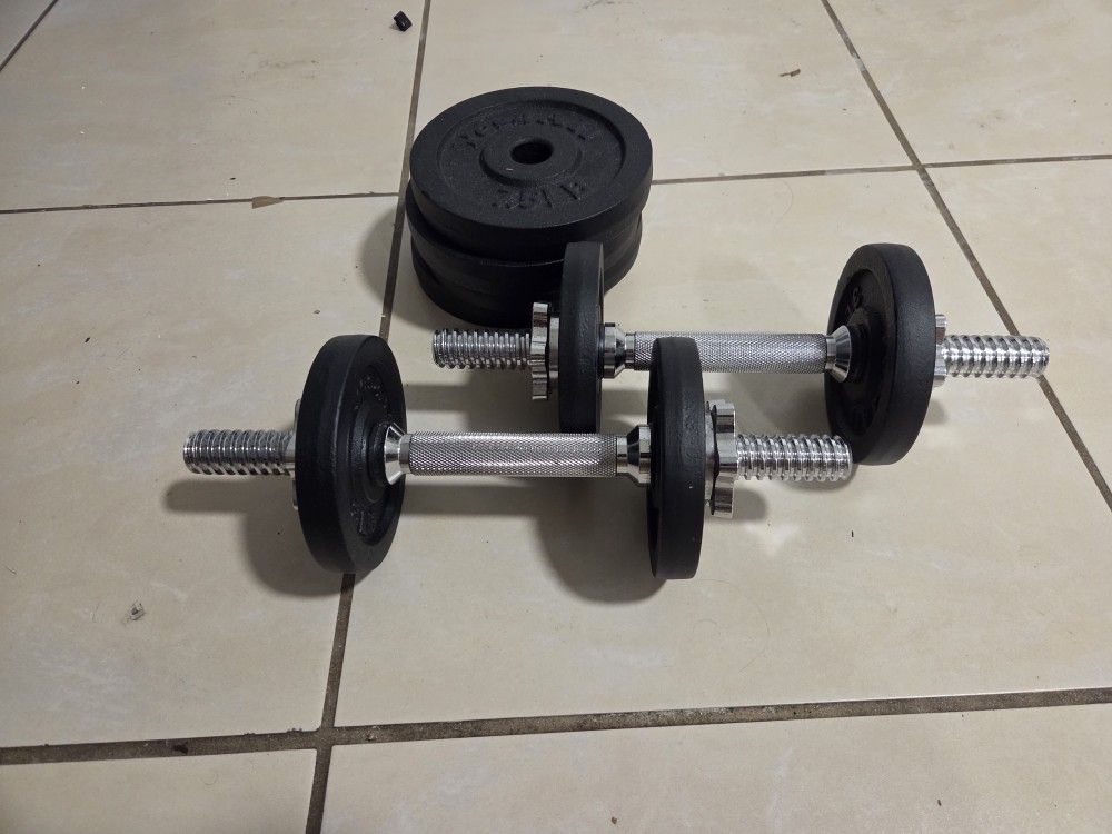 Great set of adjustable dumbbells for a home gym. Perfect for beginners or high-rep toning. Everything is clean and the locks work perfectly. What’s included: 2 Threaded Handles (Holders) 4 x 7.5 lb Plates 4 x 3.0 lb Plates 4 Star-lock collars (to keep weights secure) Total weight: 42 lbs.