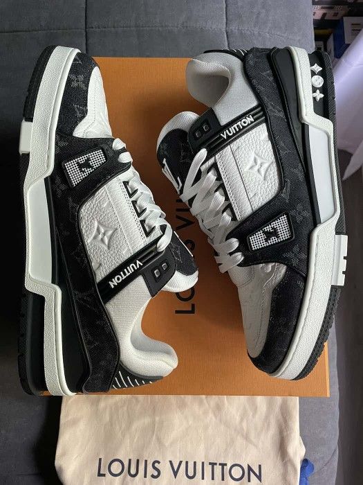 The iconic lv trainer sneaker is revisited this season in a combination of monogram denim and monogram-embossed grained calf leather. The contrasting colors and materials highlight the elaborate construction of this model, which was inspired by vintage basketball sneakers. A single pair takes seven hours to stitch.