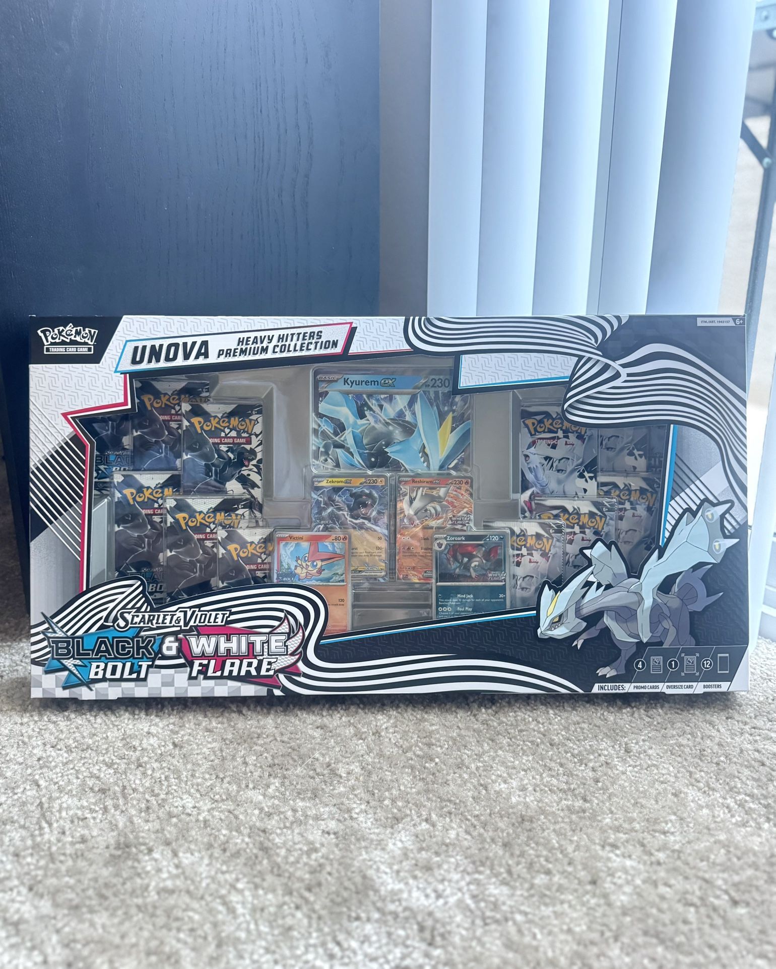 The Pokémon TCG: Unova Heavy Hitters Premium Collection includes: • 6 Pokémon TCG: Scarlet & Violet-Black Bolt booster packs • 6 Pokémon TCG: Scarlet & Violet-White Flare booster packs • 2 foil promo cards featuring Zekrom ex and Reshiram ex • 2 foil promo cards featuring Victini and Zoroark • 1 oversize foil promo card featuring Kyurem ex. $90