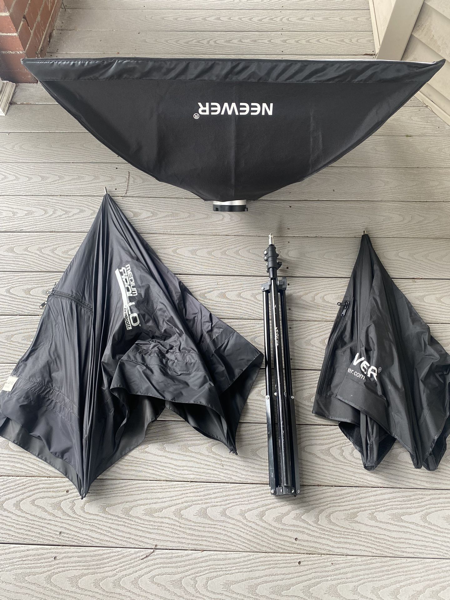 Greetings shoppers! For sale are 3 studio photography soft boxes. a Neewer tripod stand, and tripod attachment for flashes or umbrellas. I have too many soft boxes and I’m not using these. Selling for $100. Thanks for viewing