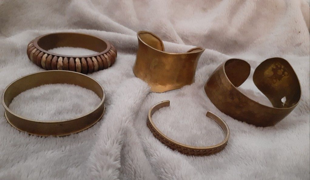Nice collection of vintage brass bracelets. No markings. Has vintage patina can polish to a shine if you want. Some sticker residue inside 2 bracelets. Great vintage conditon.