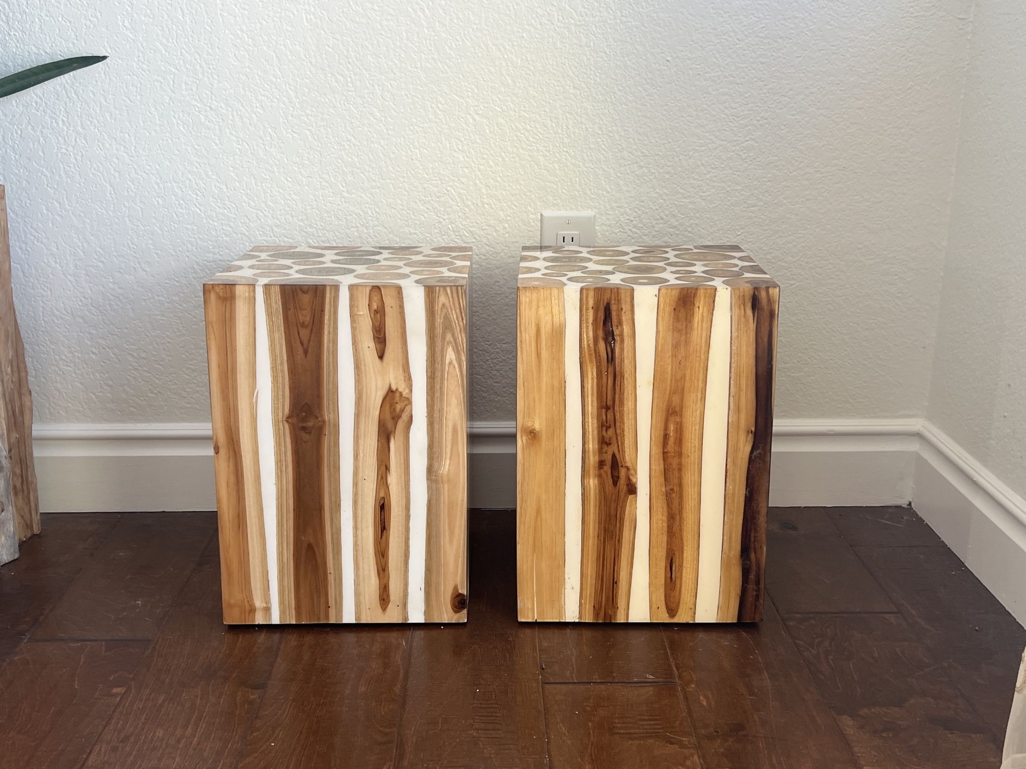 These are resin and I’m not sure if it’s real wood inside but they look really cool! They’re 16” high and 12” wide by 12” deep. I used them for plant stands but you could use them for anything you want to add a little lift to - statues, speakers, etc. I have lots of plants, pots, and tables for sale so please see my other posts if you’re interested!
