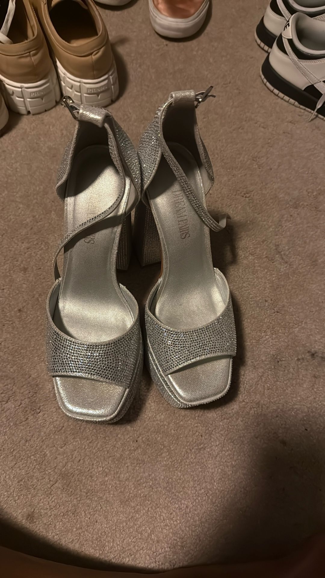 Size 9 Worn once Right shoe has a small scuff mark in the front , left shoe has two tiny stones missing on the heel.