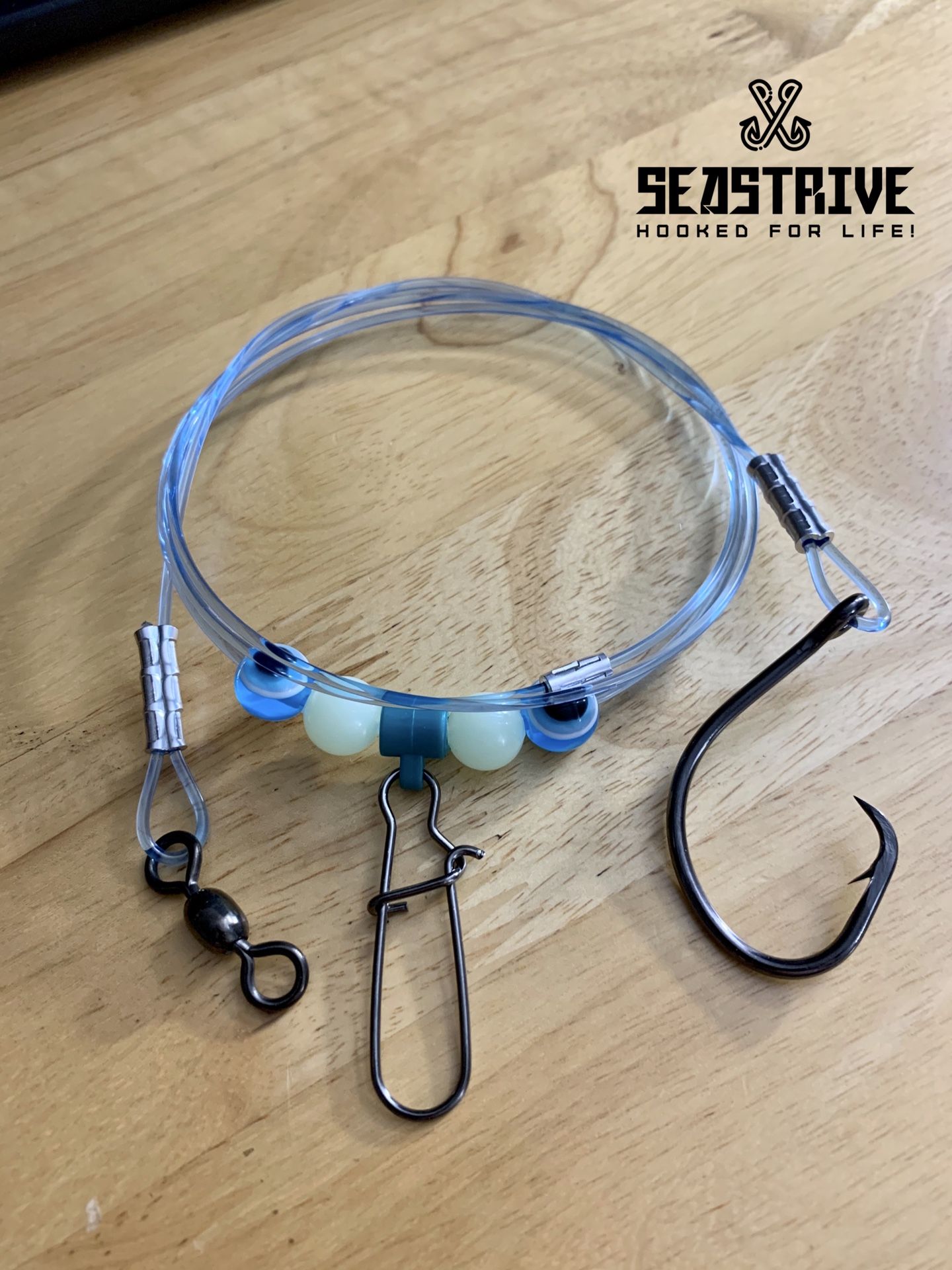 300lb Monofilament Test Leader Line 4/0 - 350lb Premium Brass Swivel Eagle Claw Lazar Sharp 10/0 Circle Sea Hook Double Barrel Aluminum Crimp Sleeves Single Barrel Aluminum Stop Crimp Heavy Duty Sinker Slider w/ 2” Duo Lock Snap 12mm Fish Eye Beads/12mm Round Glow Beads Choose from 3’ to 4’ Leader Colors Available: Clear, Light Blue Classic Rig for Bull Reds & Black Drum Hooks also available to choose: Eagle Claw Circle Sea Hook: 9/0, 10/0, 11/0, 12/0, 13/0 Eagle Claw O'Shaughnessy Non-offset Seaguard Hook: 6/0, 7/0, 8/0 Mustad Treble Hook: 2/0 (at NO extra charge)