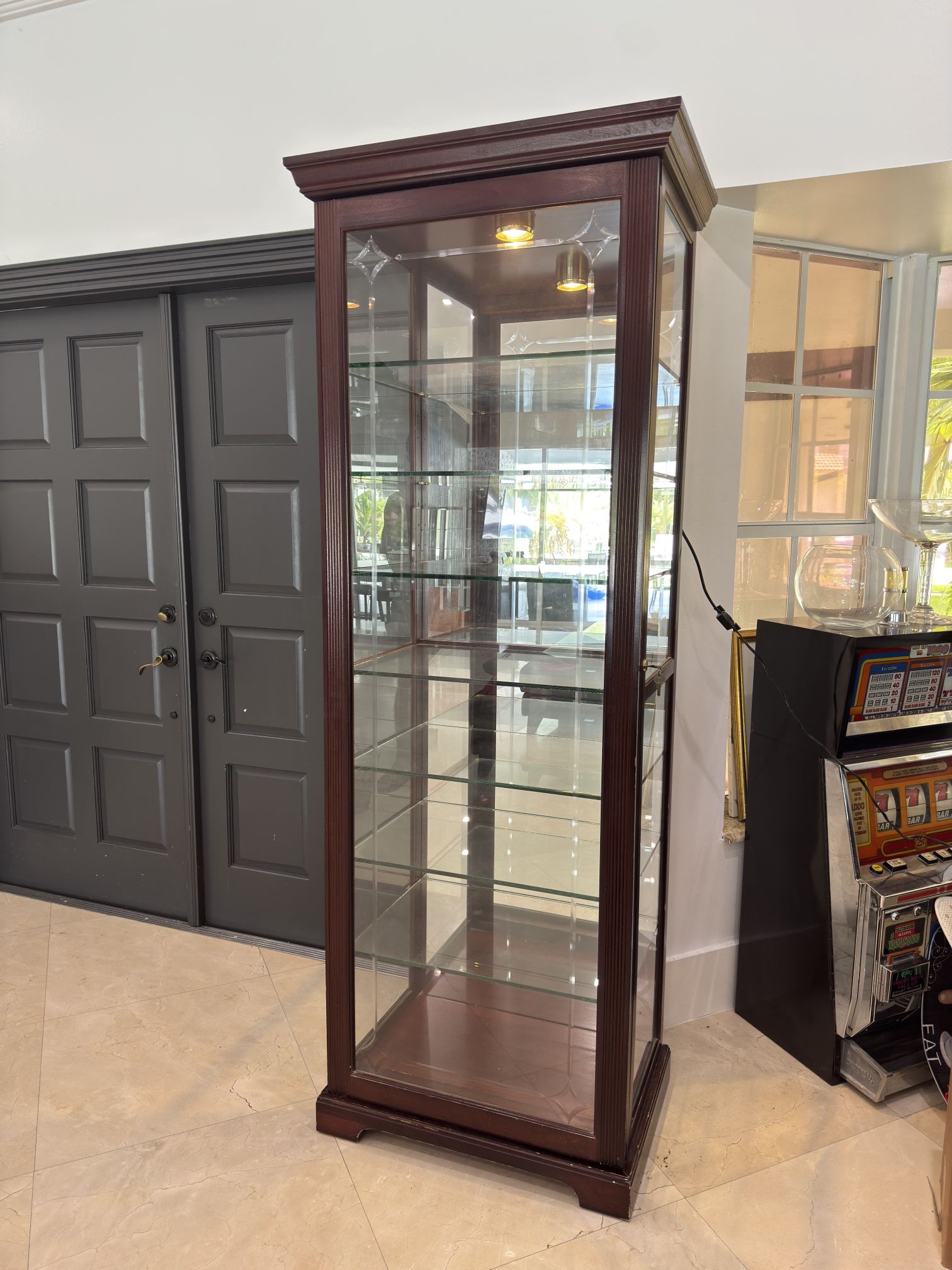 Elegant glass curio cabinet with interior lighting, mirrored back, and multiple glass shelves for beautiful display. Framed in a rich mahogany wood finish. Great condition with working light