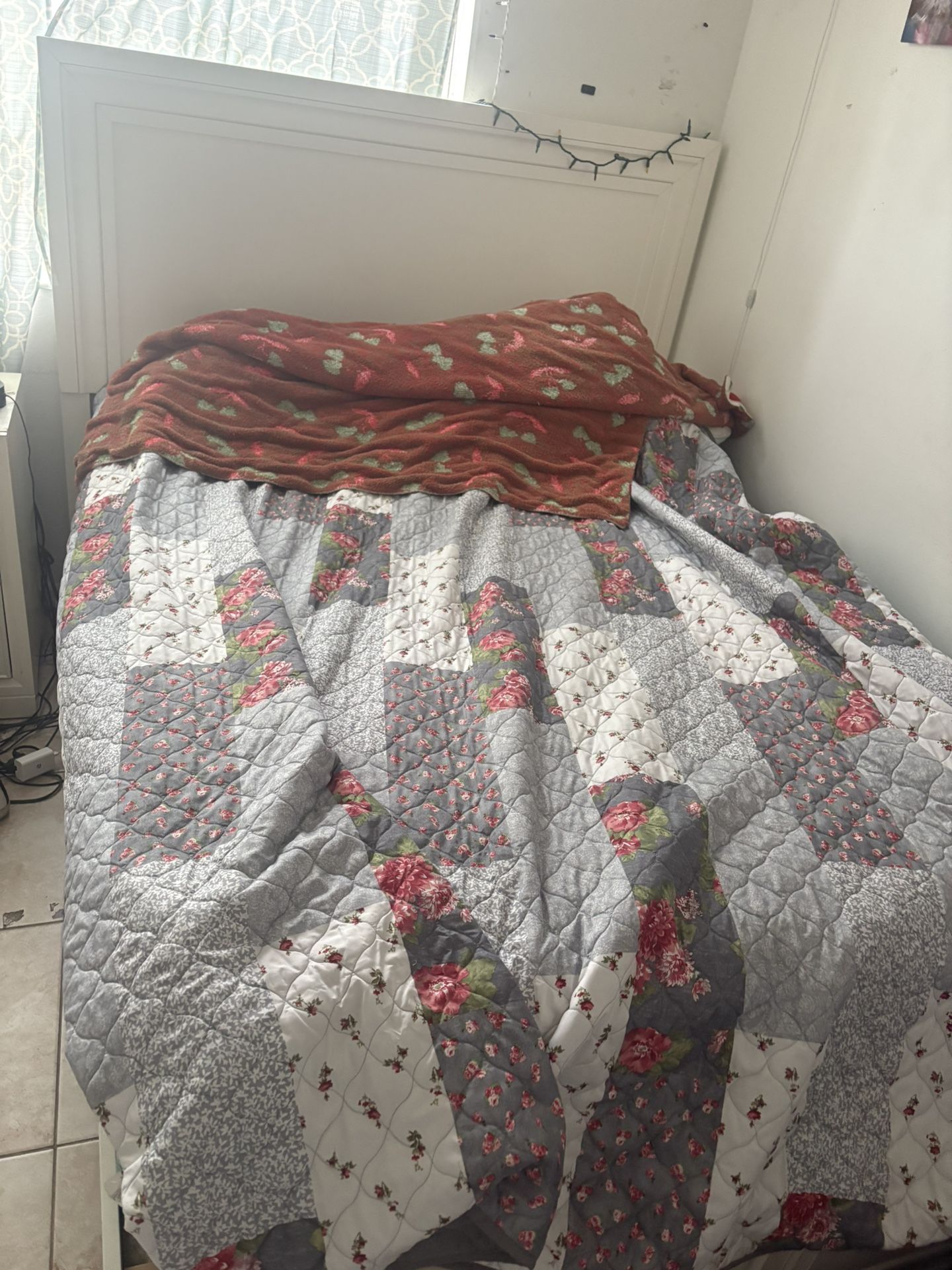 This is a used queen bed frame with six cabinets on the bottom for storage