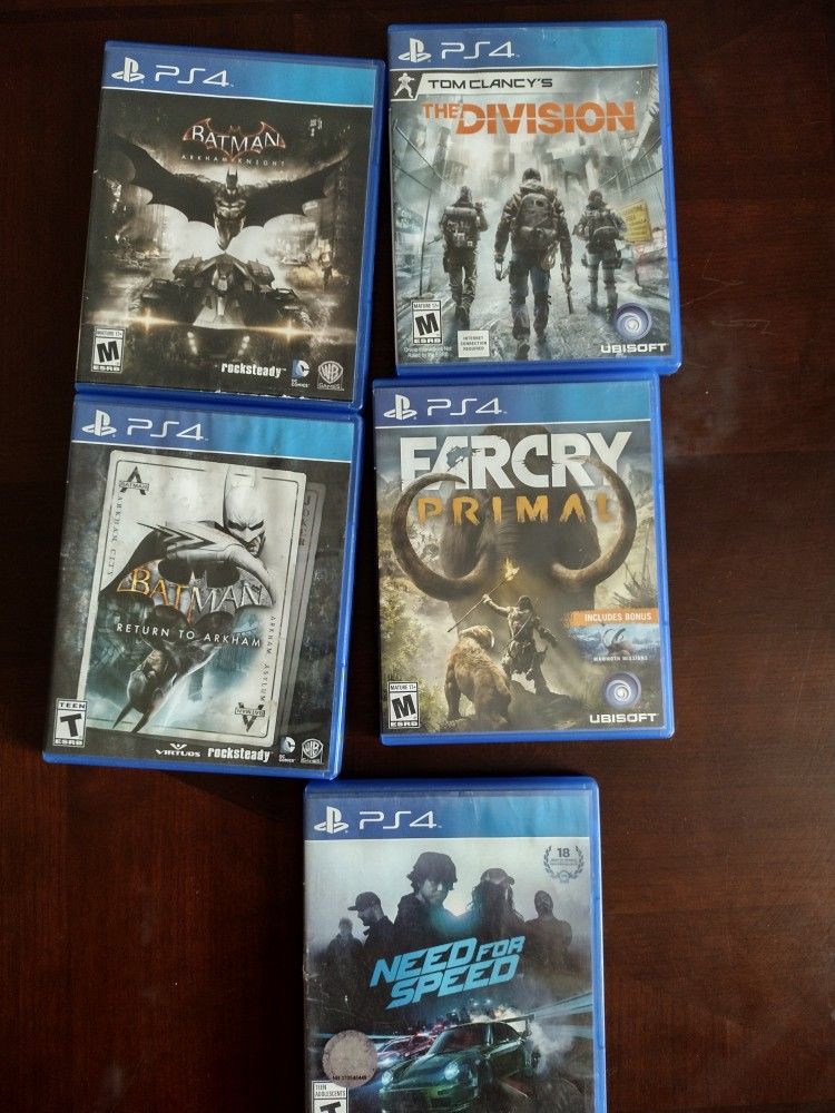 All for $30 everything you see please don't msg me to go lower msg me when ready for individual sale Pricing are the following : Batman Arkham Knight $10 The division. $10 Farcry primal. $15 Batman returns to Arkham $15 Or all for $30 Already sold need for speed