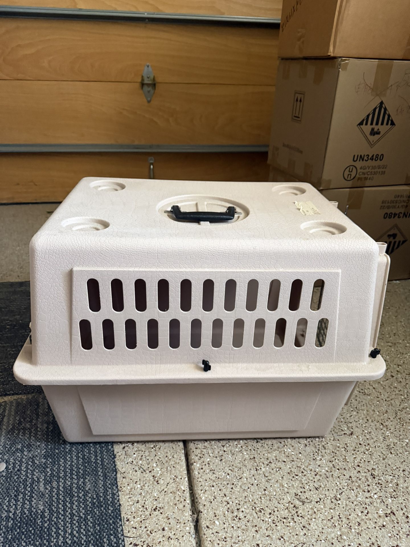 Size 26” (L)x 19” (H)x 16”( W) Used less than 3 times. Like New Airline Friendly Dog Carrier: This pet carrier meets most airline cargo specifications. This travel dog crate also has ventilation on 4 sides. Includes built in storage for additional pet identification