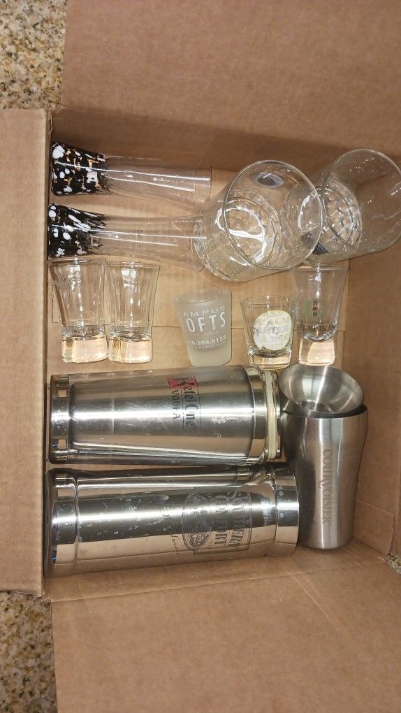 2 Cutty Sark Glasses $5, 2 tall shot glasses $5, 2 Sobieski shot glasses $5, 3 random shot glasses $2 each, and 3 mixers $5 each (Courvoisier, Southern Comfort, and Ketal One) $30 the whole box.