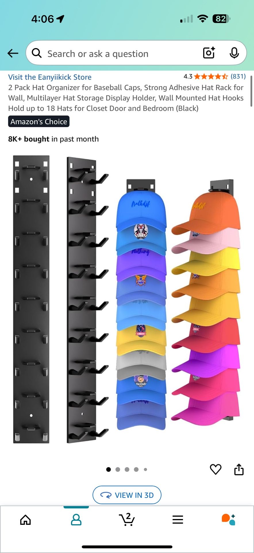2 Pack Hat Organizer for Baseball Caps, Strong Adhesive Hat Rack for Wall, Multilayer Hat Storage Display Holder, Wall Mounted Hat Hooks Hold up to 18