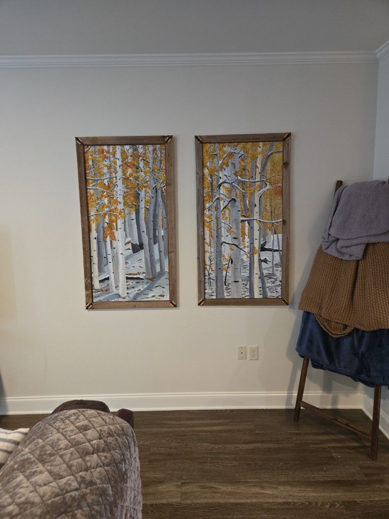 Large hand paintings on wood with unique wood frames.