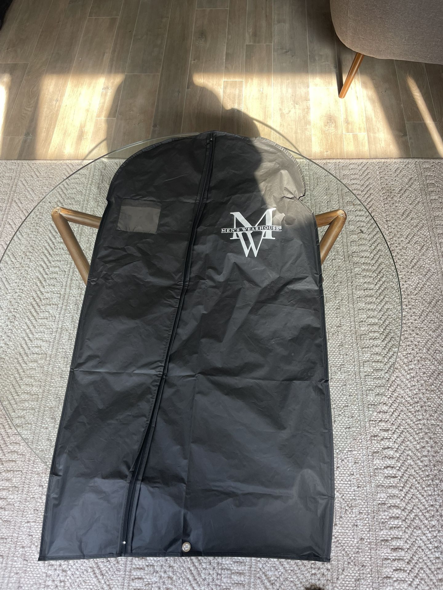 in perfect shape, had my suit stored in it recently, but outgrew it so I donated the suit has a hole to accommodate a hanger made out of a windbreaker tarp material to repel water and dust it’s a one size fits most Suits