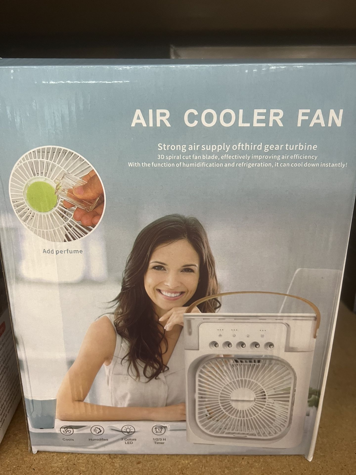 Air cooler fan. New in box. Have a few left. -Cools -Humidifies -7 colors LED -1/2/3 hour timer Ventilador enfriador de aire. Nuevo en caja. Me quedan algunos. -Enfría -Humidifica -LED de 7 colores -Temporizador de 1, 2 o 3 horas