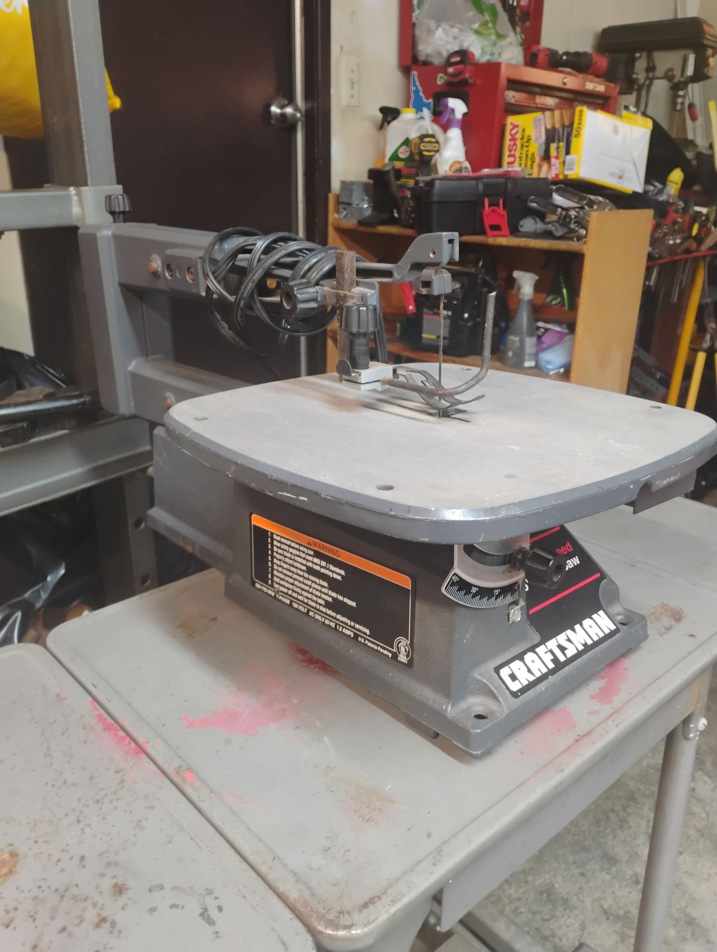 I have a Craftsman 16" scroll saw. Variable speed. Works good. It also comes with a steel rolling cart to mount it on if you want it. The sides of the cart fold down. There is a drawer for storage. The wheels have a foot lever to raise and lower when you want to roll it around.