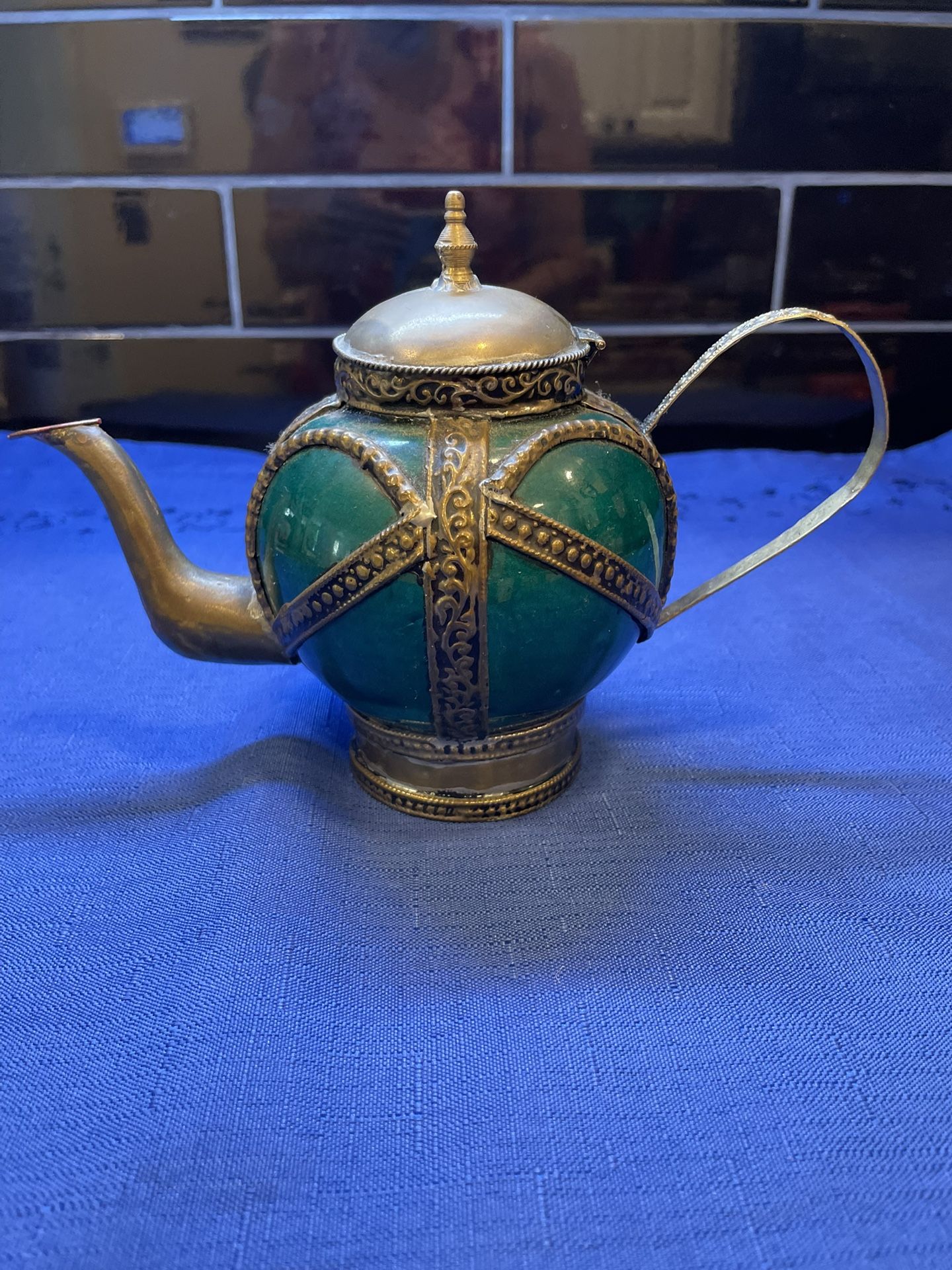 Beautiful vintage green ceramic Moroccan pottery teapot. This teapot is encased in patterned brass with lid. Beautiful and decorative with original patina. This has a couple of cracks on one side but doesn’t detract from beauty.