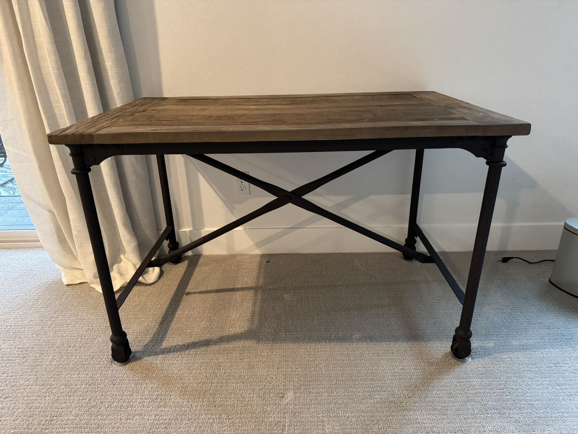 Selling our Restoration Hardware 18th C. Industrial Work Table (original cost $1,595) with a weathered elm top and matching chair we got from Cost Plus World Market (original cost $200). Reclaimed wood top with cast iron base and original casters. Solid, heavy, and extremely well made. No longer sold in this size. Fits perfectly as a writing desk, office desk, or craft table. Both items must be sold together as we need to get rid of them quickly to make space for a new desk. Aside from a little dust, the desk looks as good as brand new! Dimensions: 48” W x 24” D x 30” H As the iron base is heavy caste, we’d guess it weighs between 80-110 lbs. Happy to help you load it in your car, but would recommend bringing a friend and make sure you have a truck or large vehicle! Open to delivering for an additional $50.