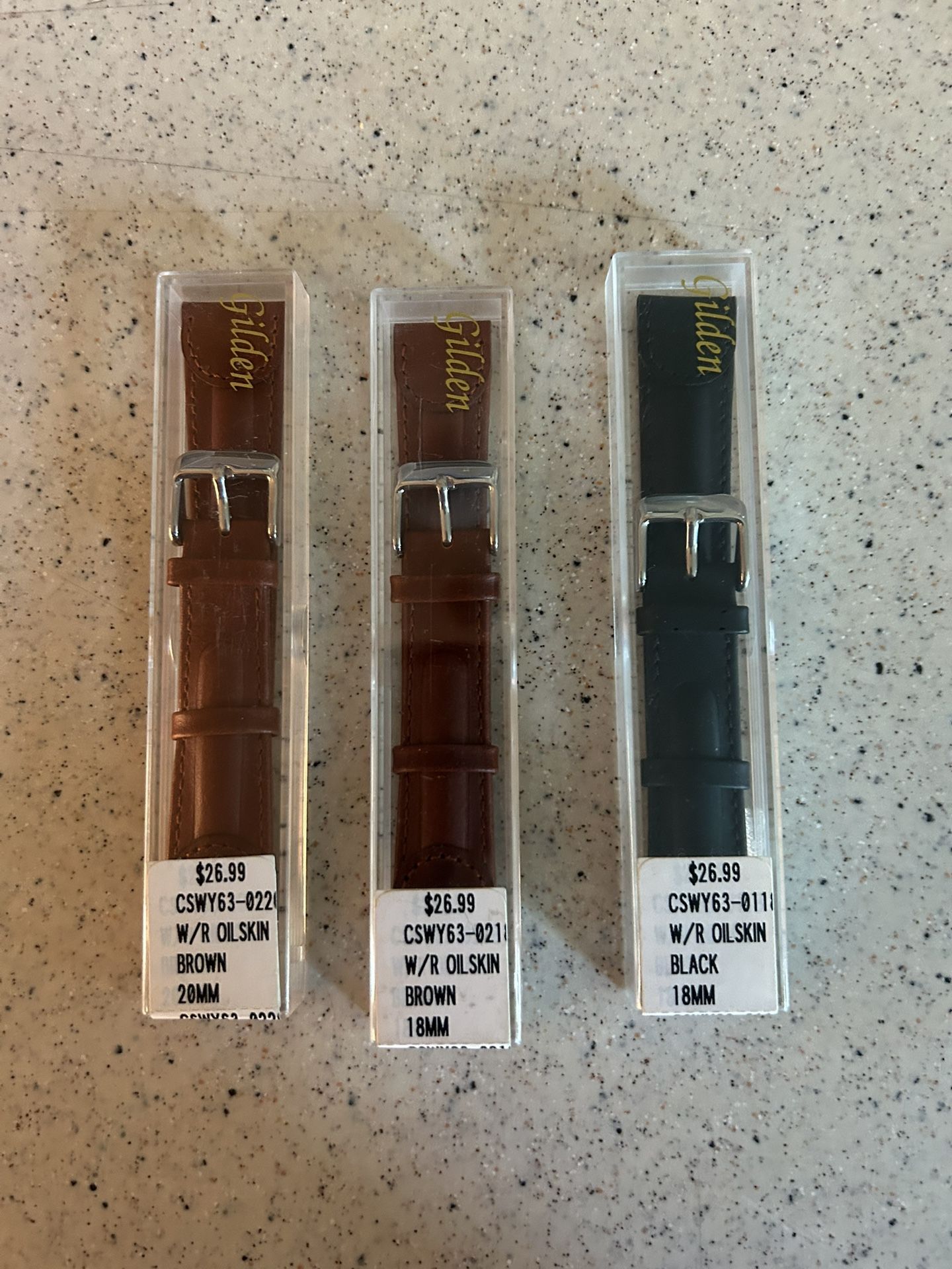2-18 mm bands & 1-20 mm band. Genuine leather w gold buckles, one black & two brown. Buy all three price will drop to $37.